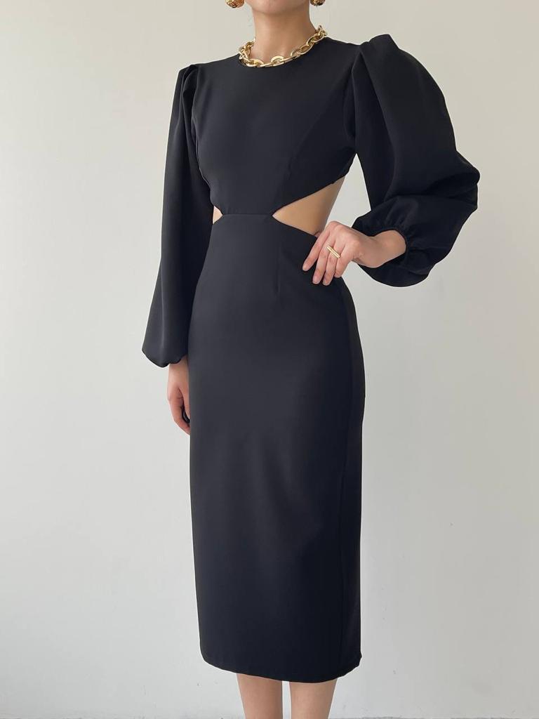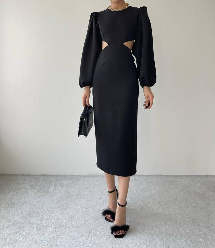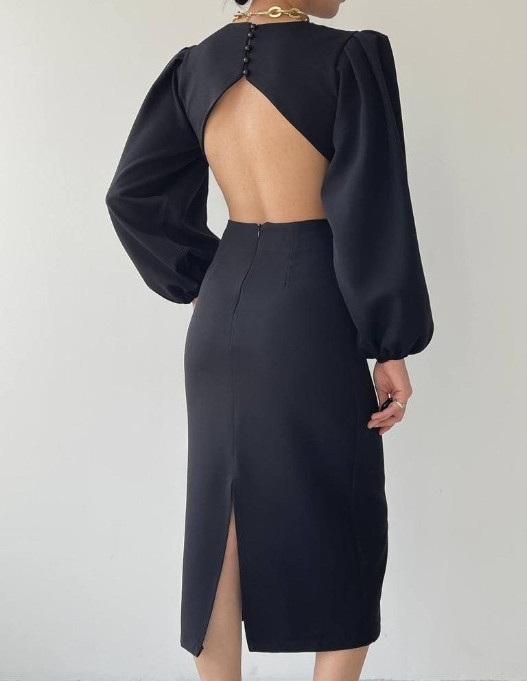 Elevate your fashion game with our balloon sleeve cutout midi dress. Make a bold statement while embracing the sophistication of contemporary design. Featuring an open back and button fastening at the neck.