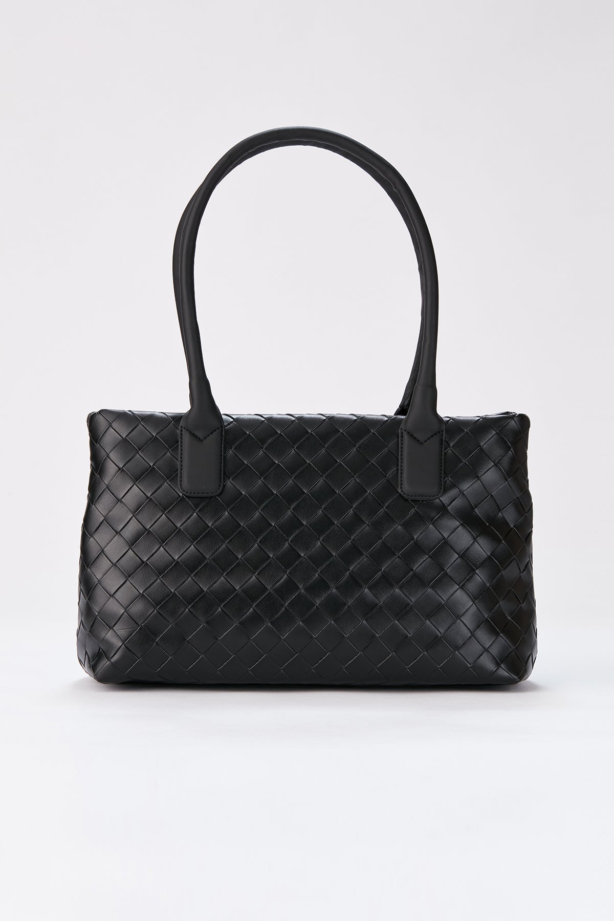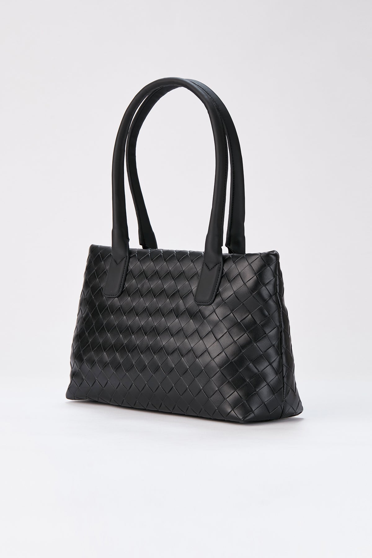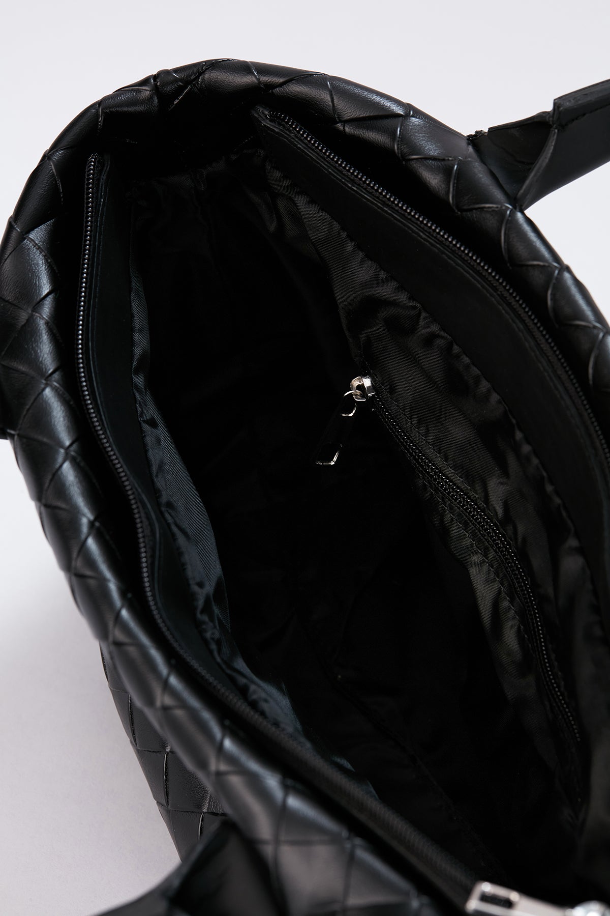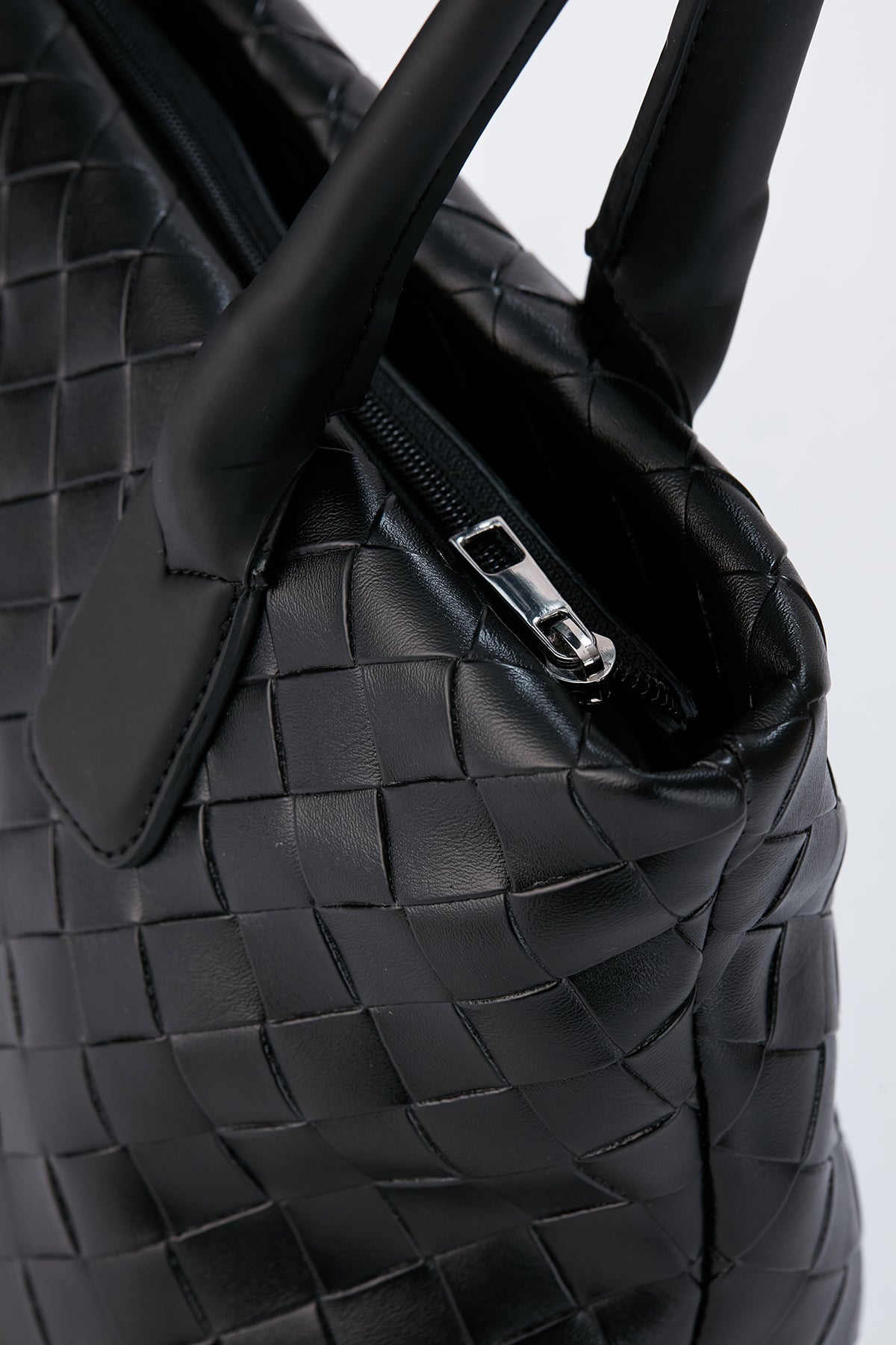 Siyah örgülü vegan deri tote çantamızla tarzınızı yükseltin - günlük görünümünüzü tamamlamak için tasarlanmış şık ve çok yönlü bir aksesuar. Bu çanta, temel ihtiyaçlarınız için geniş bir alan sunar ve bu da onu iş, alışveriş veya günlük aktiviteler için mükemmel kılar.