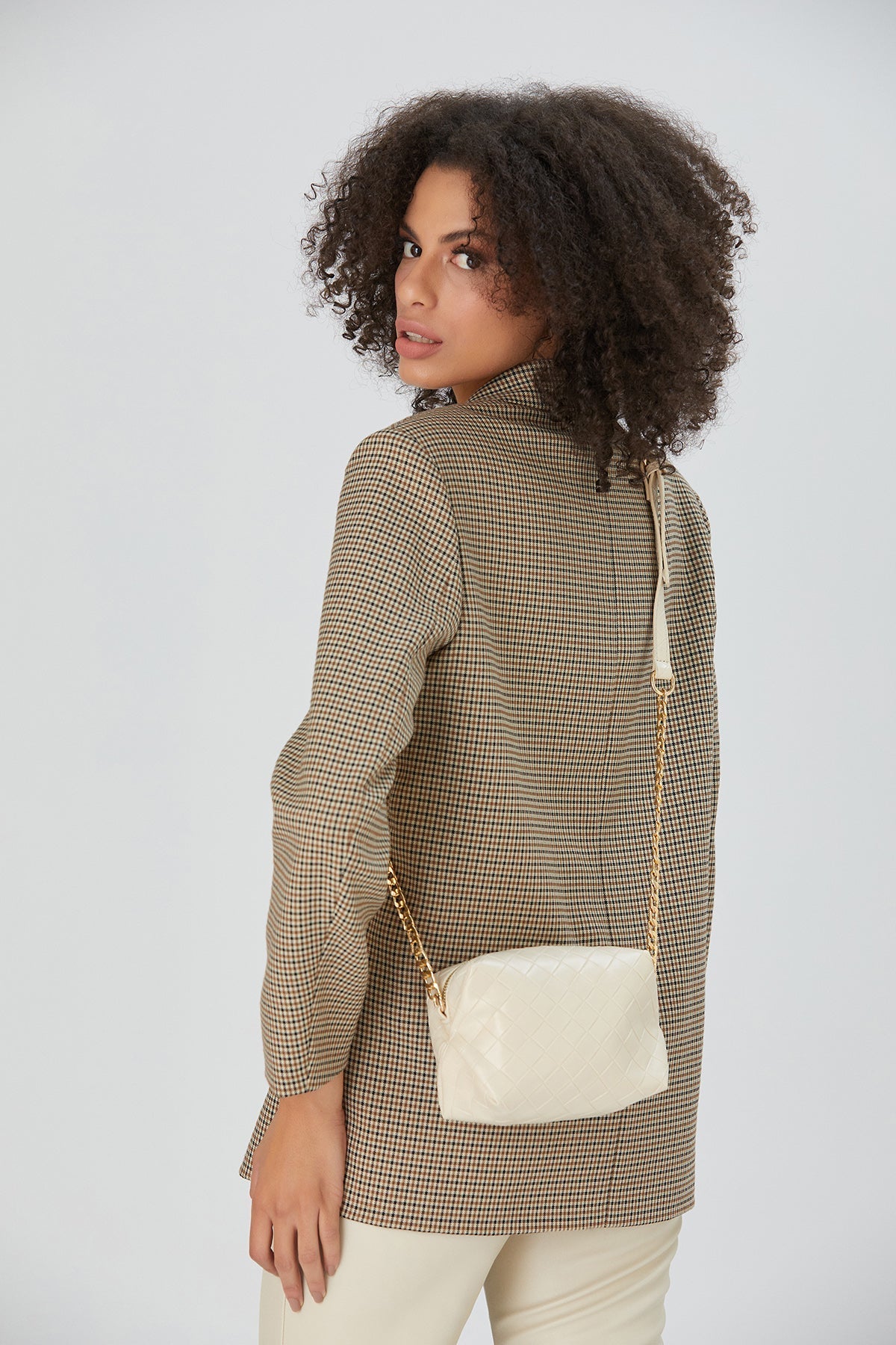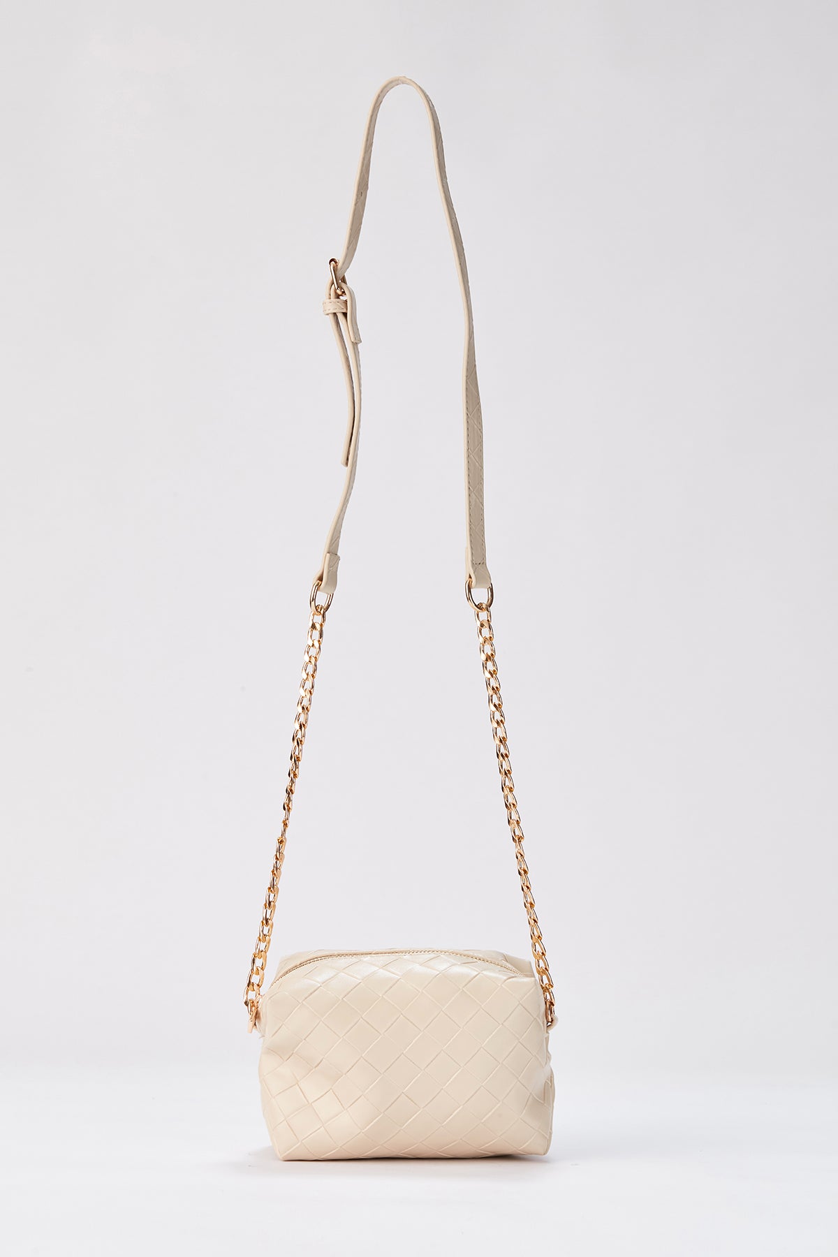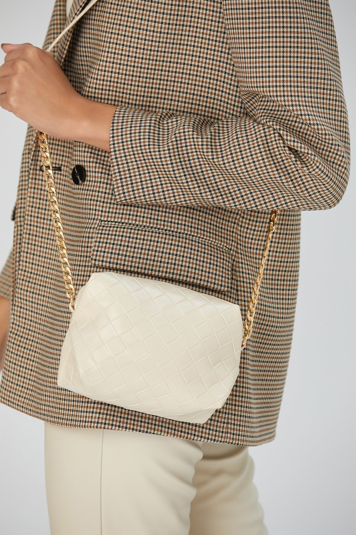 Detaylara titizlikle dikkat edilerek üretilen bu çanta, örgülü vegan derinin güzelliğini sergiliyor. Sofistike bir görünüm sunarken çevreye saygılı, modaya uygun bir seçim. Vegan deriden yapılmış ve şık bir altın zincirle süslenmiş çok yönlü ayarlanabilir kayışla istediğiniz gibi taşıyın. 56 cm'lik cömert bir düşüşle, hem konfor hem de stil sağlayarak omuz çantası olarak veya çapraz olarak takabilirsiniz.