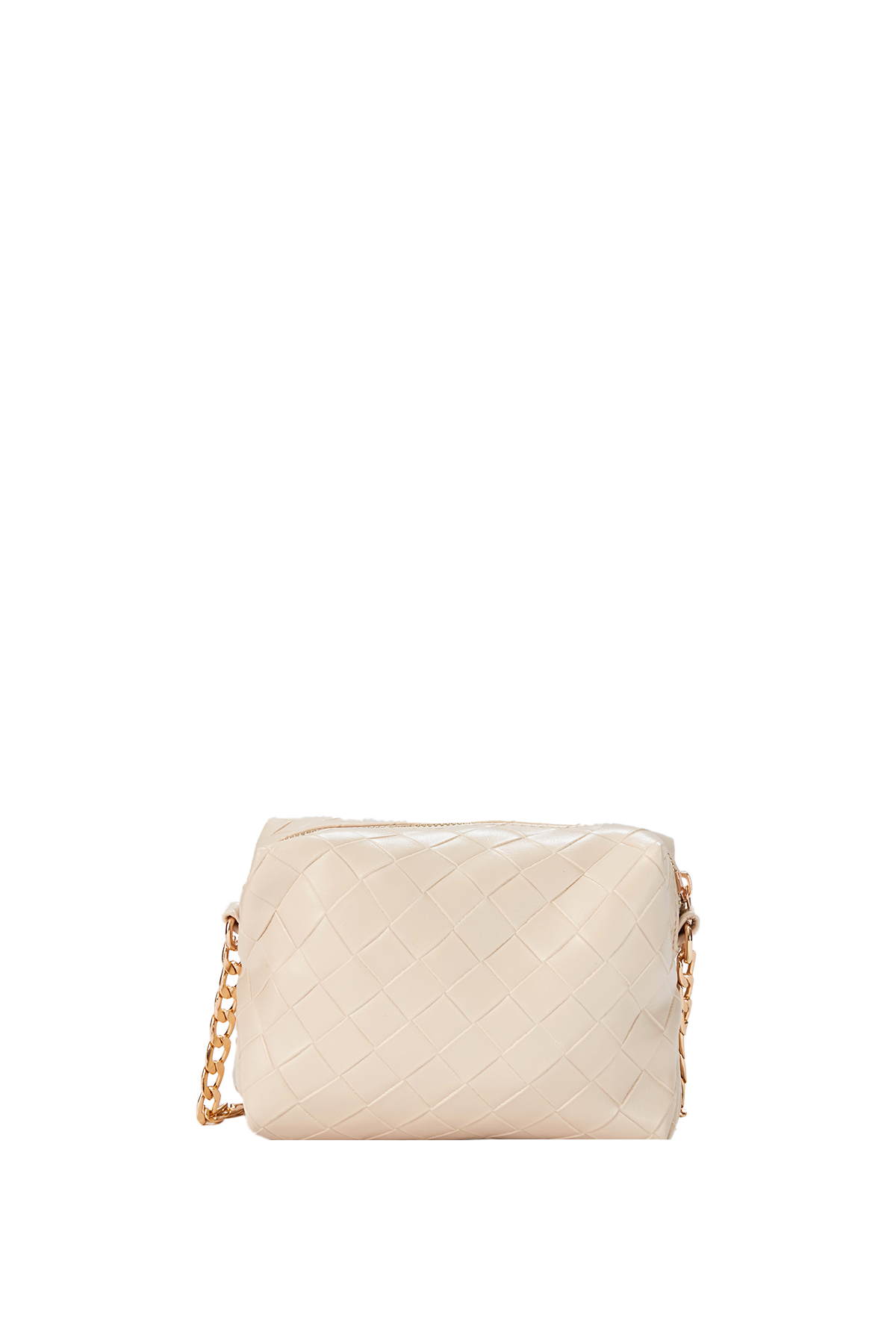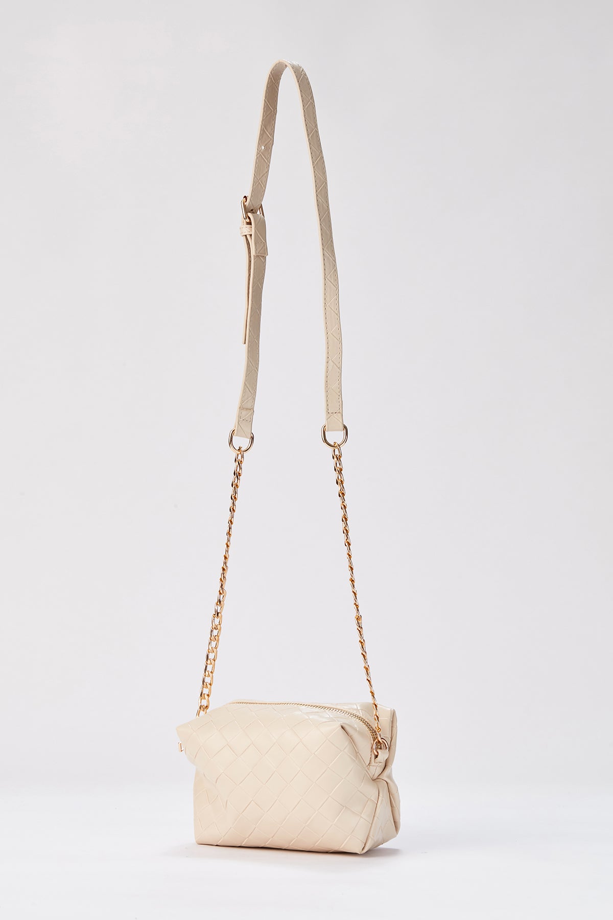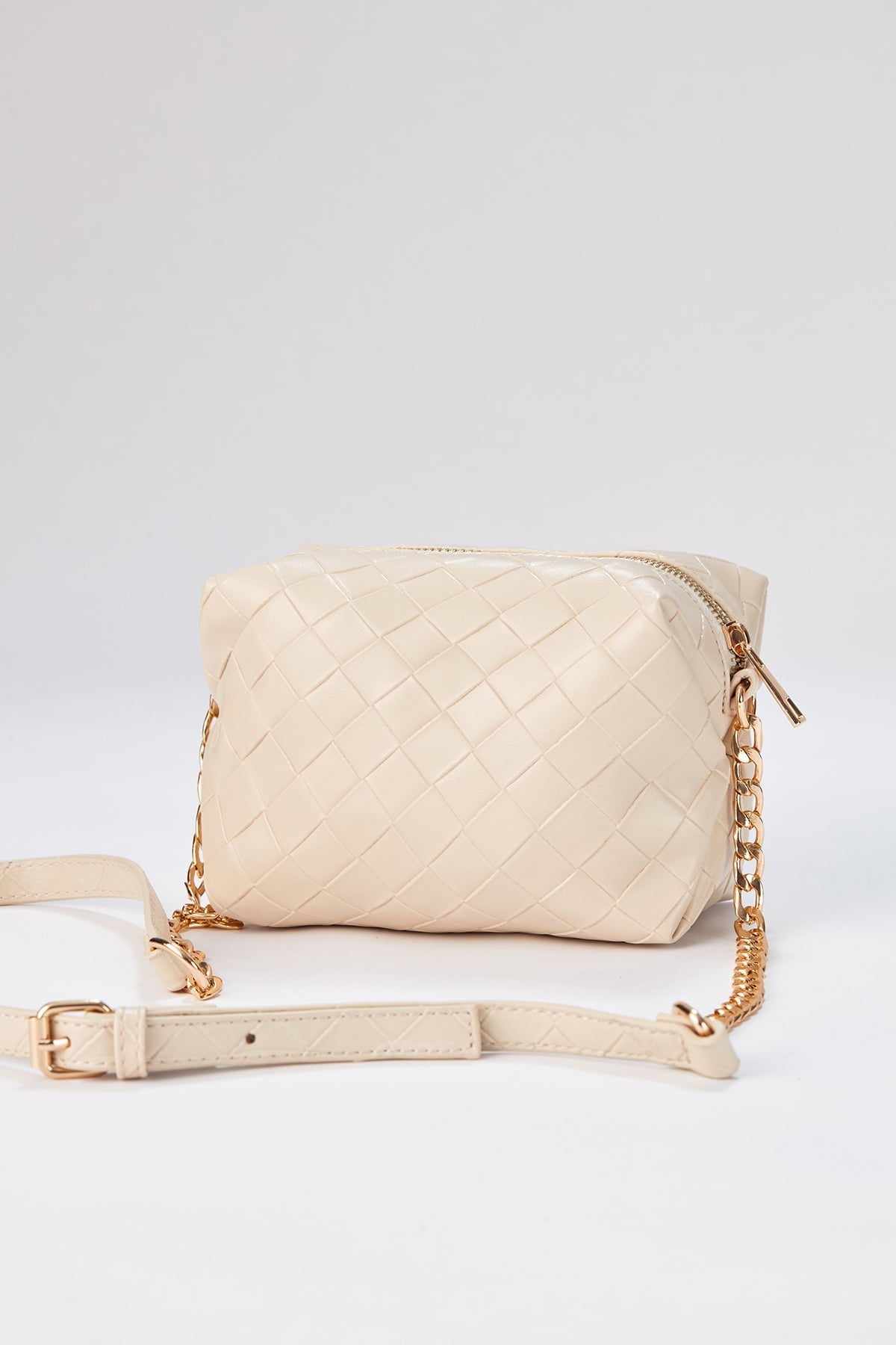 Detaylara titizlikle dikkat edilerek üretilen bu çanta, örgülü vegan derinin güzelliğini sergiliyor. Sofistike bir görünüm sunarken çevreye saygılı, modaya uygun bir seçim. Vegan deriden yapılmış ve şık bir altın zincirle süslenmiş çok yönlü ayarlanabilir kayışla istediğiniz gibi taşıyın. 56 cm'lik cömert bir düşüşle, hem konfor hem de stil sağlayarak omuz çantası olarak veya çapraz olarak takabilirsiniz.