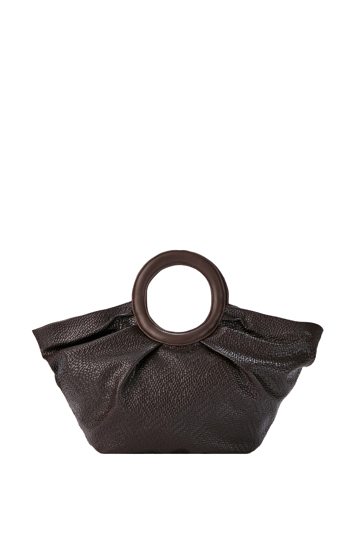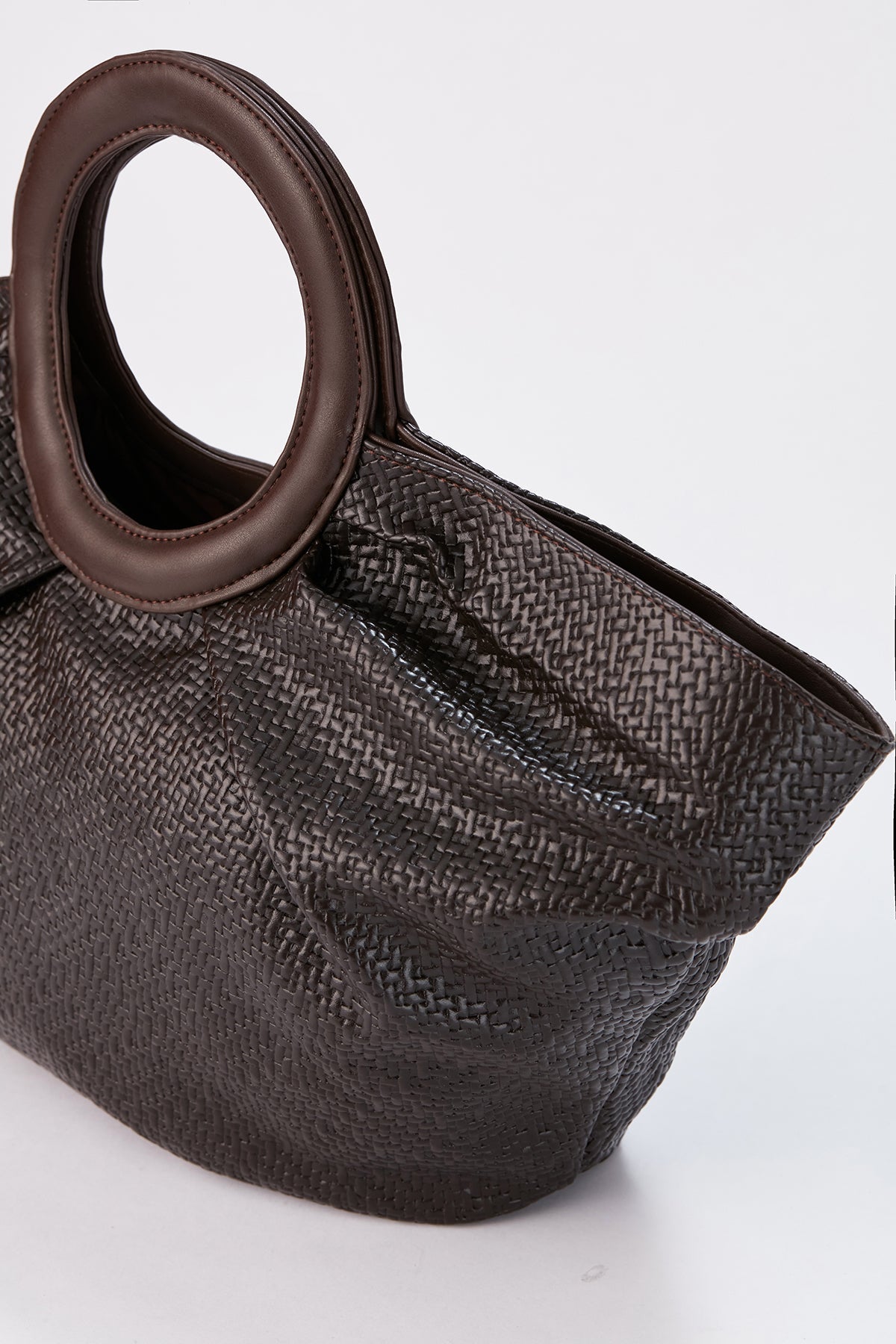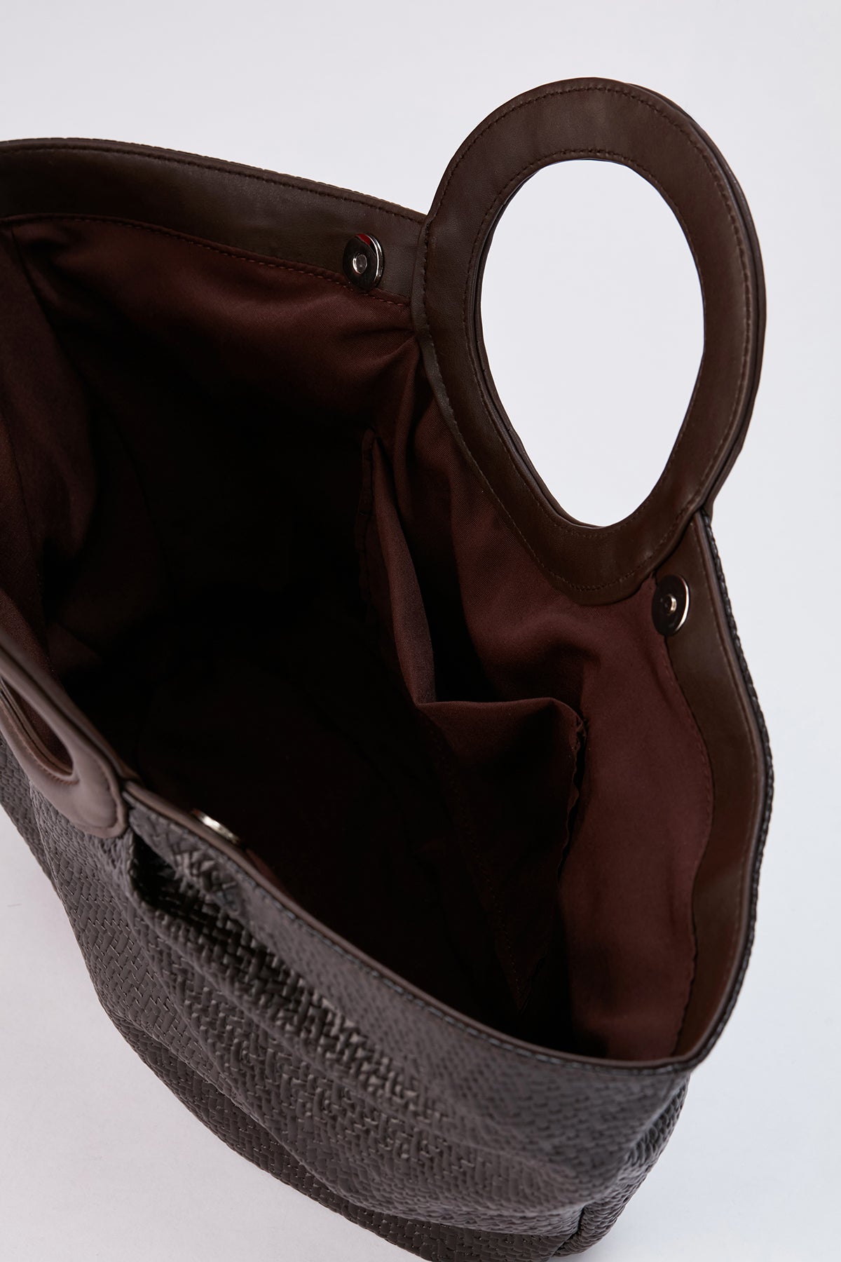 Elevate your fashion game with our fan tote bag. Its unique fan-inspired design meets practicality, offering ample space for your essentials while adding a touch of sophistication to your ensemble. Crafted from vegan leather in a diamond braided weft. Features a small pocket inside and has a magnetic closure.