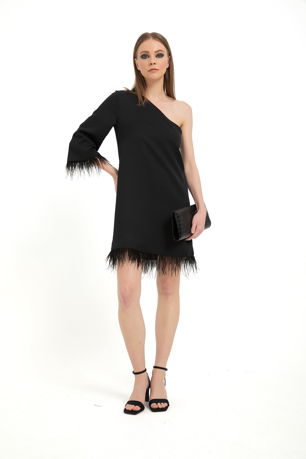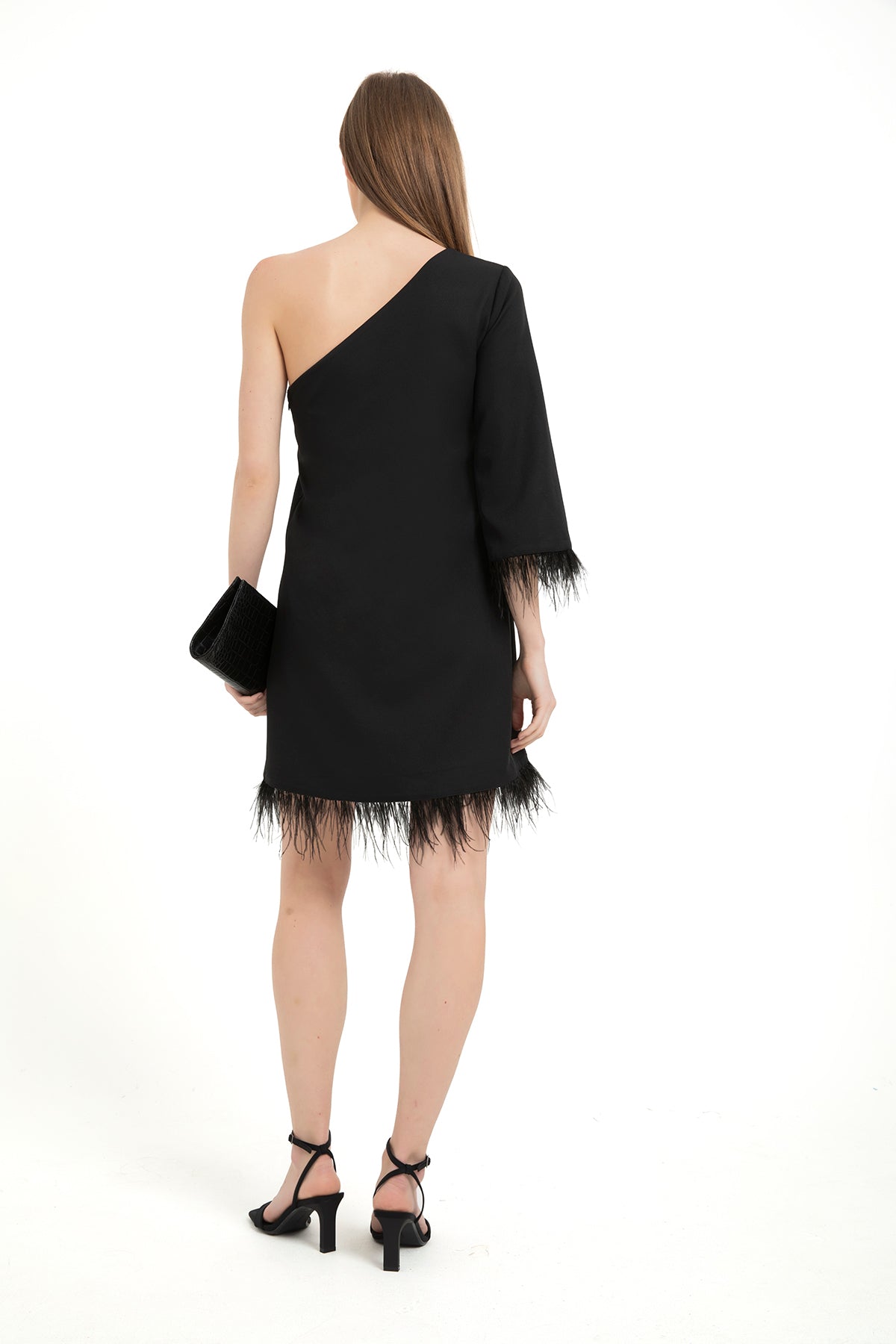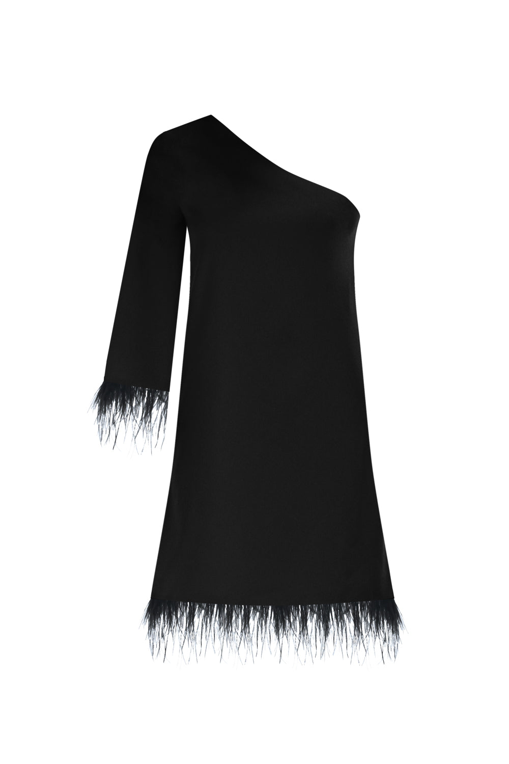 Elevate your style with our chic feather-trimmed one-shoulder, A-line mini dress in elegant black. This dress exudes sophistication, featuring a unique one-shoulder design adorned with luxurious feather trim. Whether it's a special occasion, a night out, or a formal event, this dress is your perfect choice for making a striking impression.