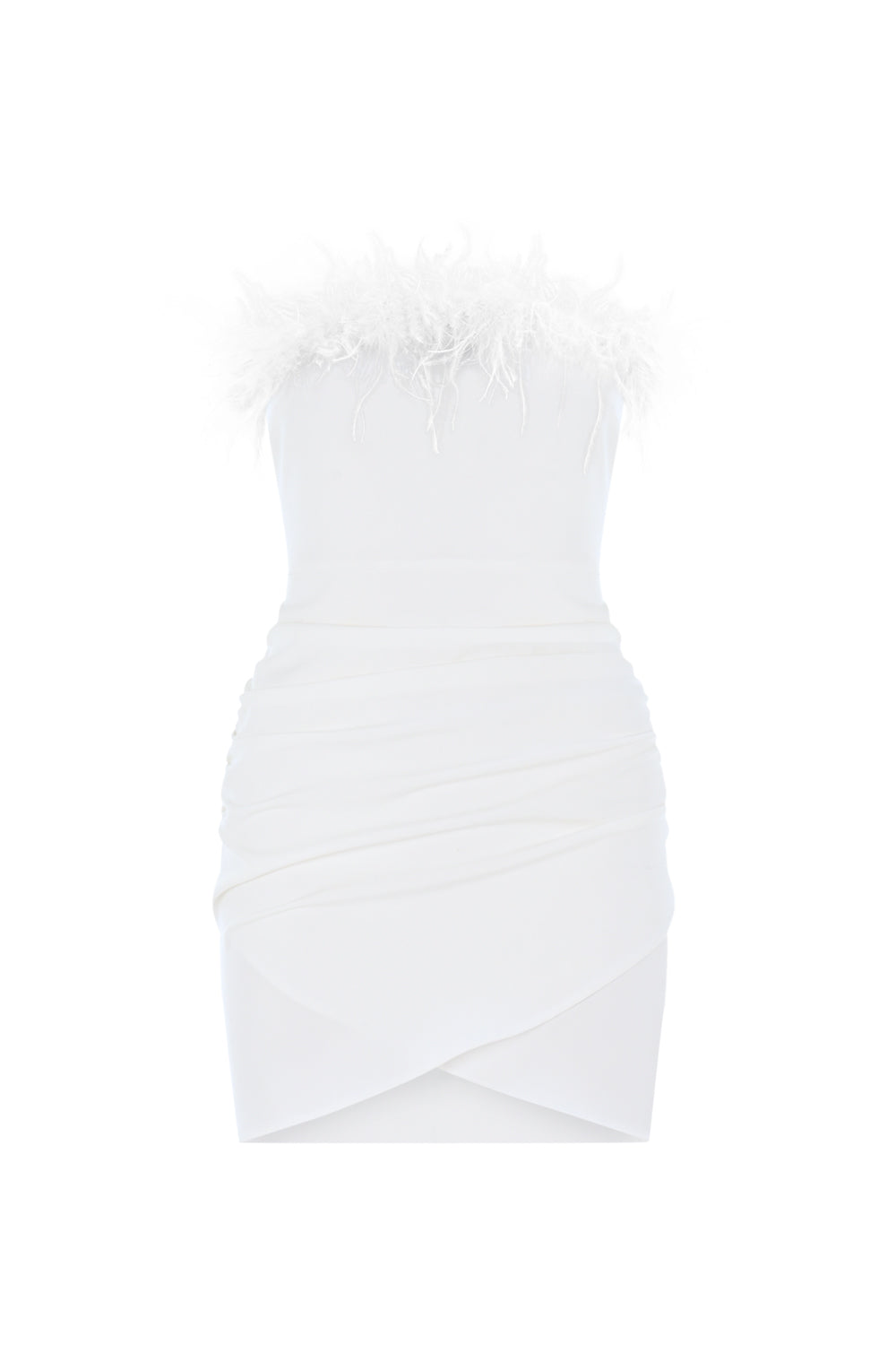 Elevate your style with our elegant strapless mini dress featuring faux feather trim in classic white. Crafted from woven fabric, this dress offers both comfort and sophistication. The striking faux feather trim on the chest adds a touch of glamour, while the invisible back zip fastening ensures a seamless fit. Whether it's a special occasion, a night out, or a chic event, this white mini dress is your perfect choice for making a captivating impression.
