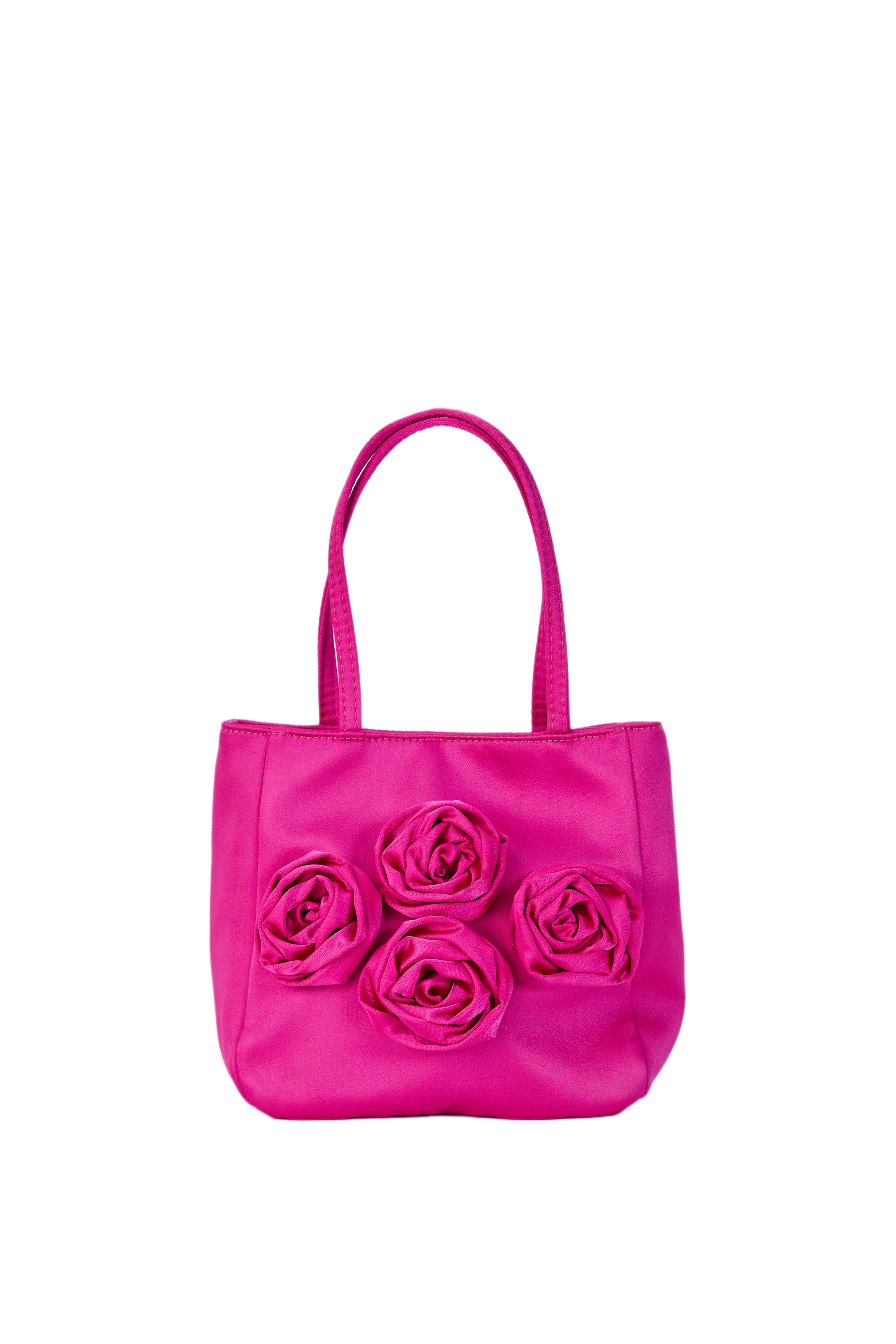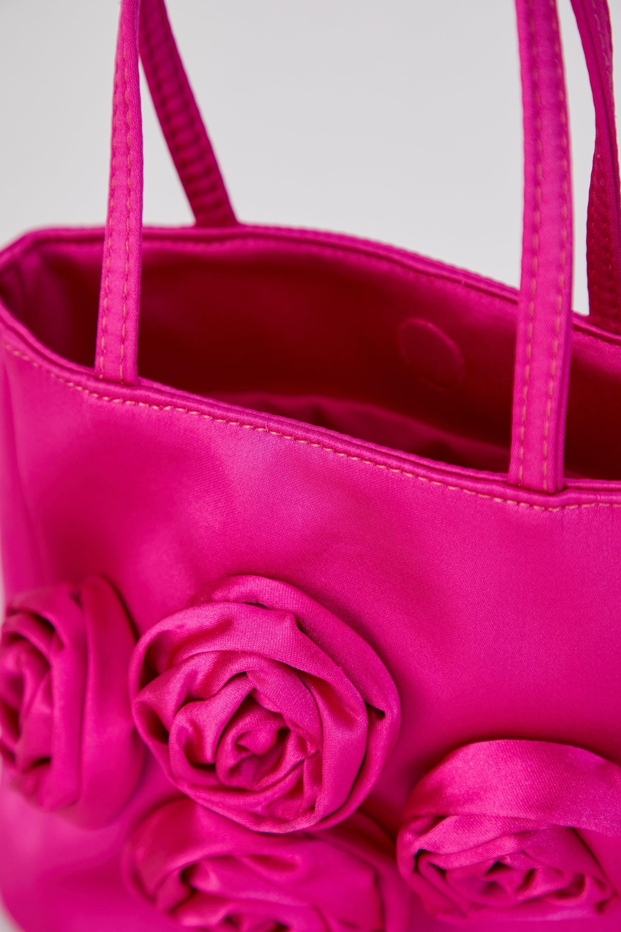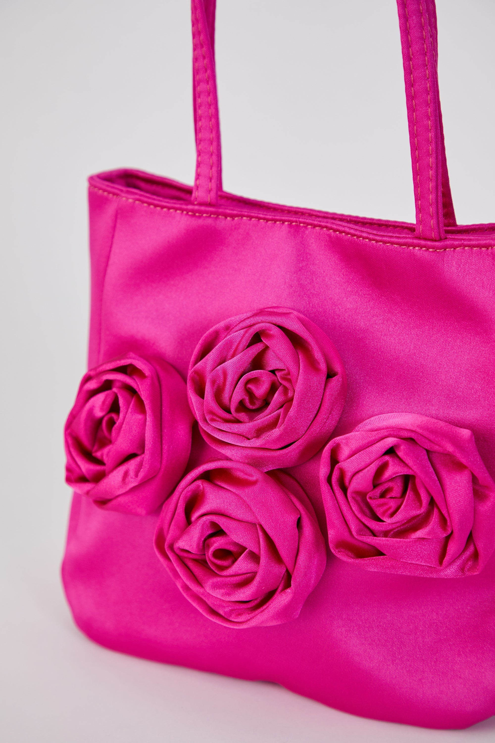This striking handbag is perfect for any occasion day or night. Handcrafted from premium recycled satin embellished with a quartet of roses. Fully lined, with one main compartment and a magnetic closure. Carry by the satin handle or use the satin crossbody/shoulder strap.