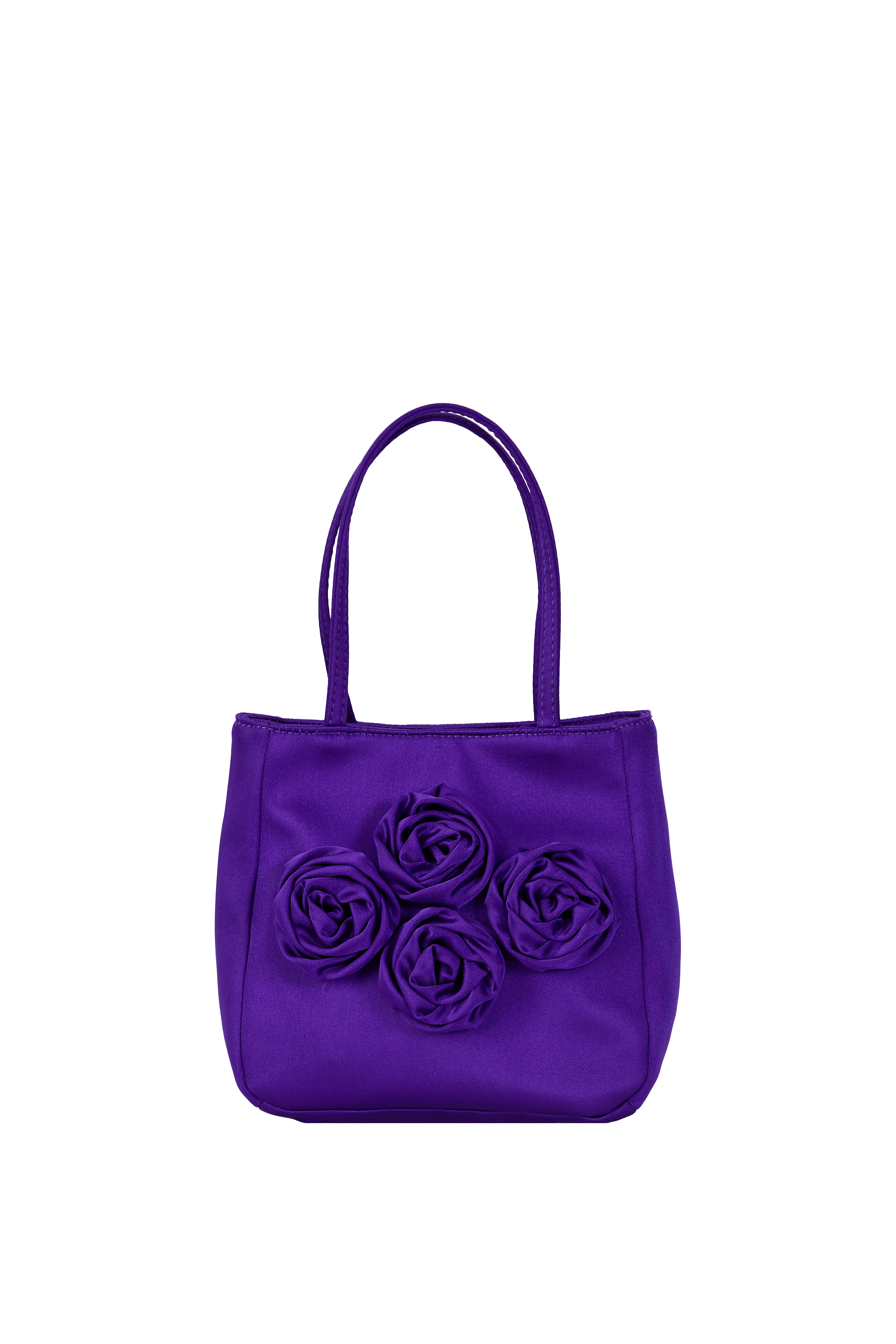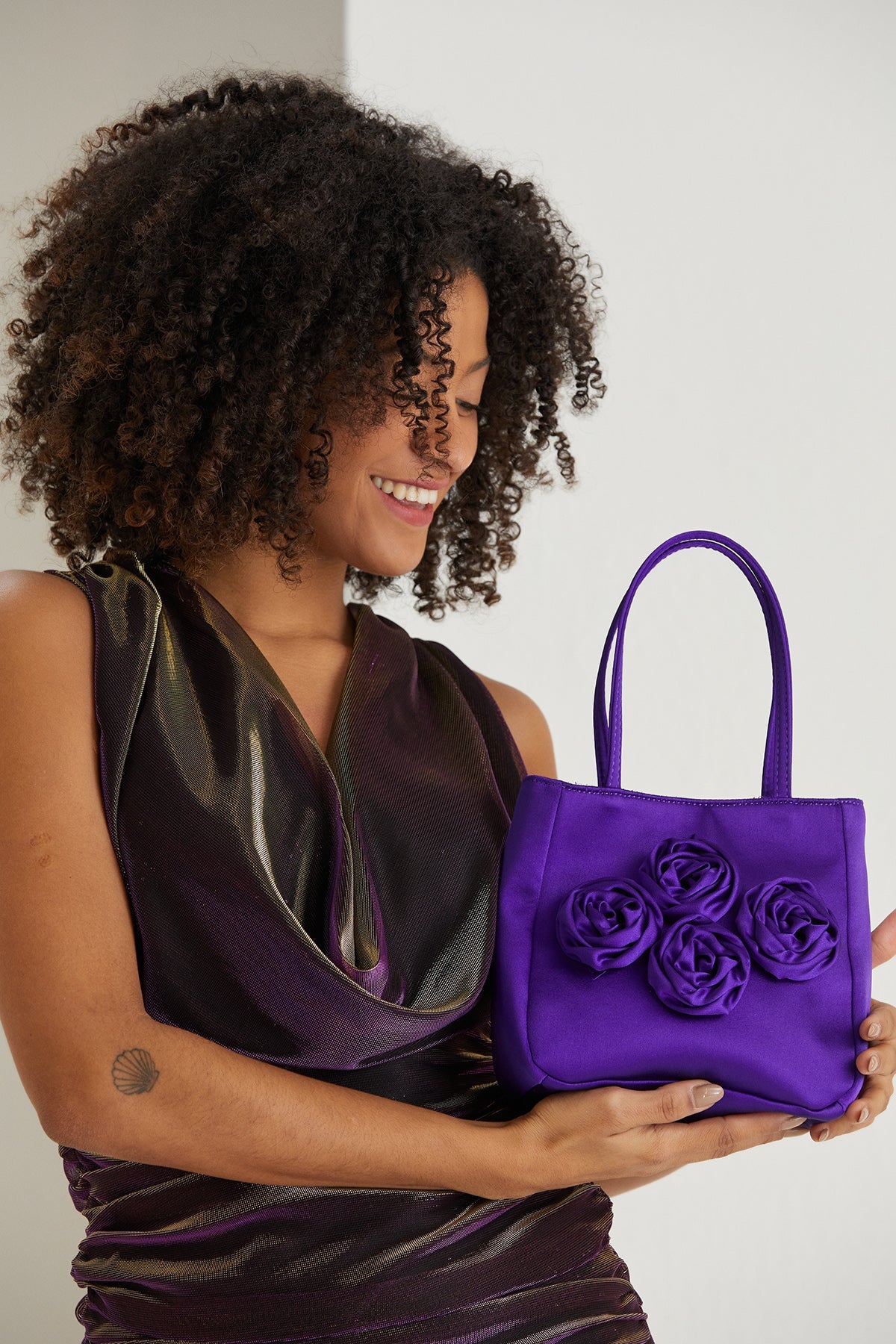 This striking handbag is perfect for any occasion day or night. Handcrafted from premium recycled satin embellished with a quartet of roses. Fully lined, with one main compartment and a magnetic closure. Carry by the satin handle or use the satin crossbody/shoulder strap.
