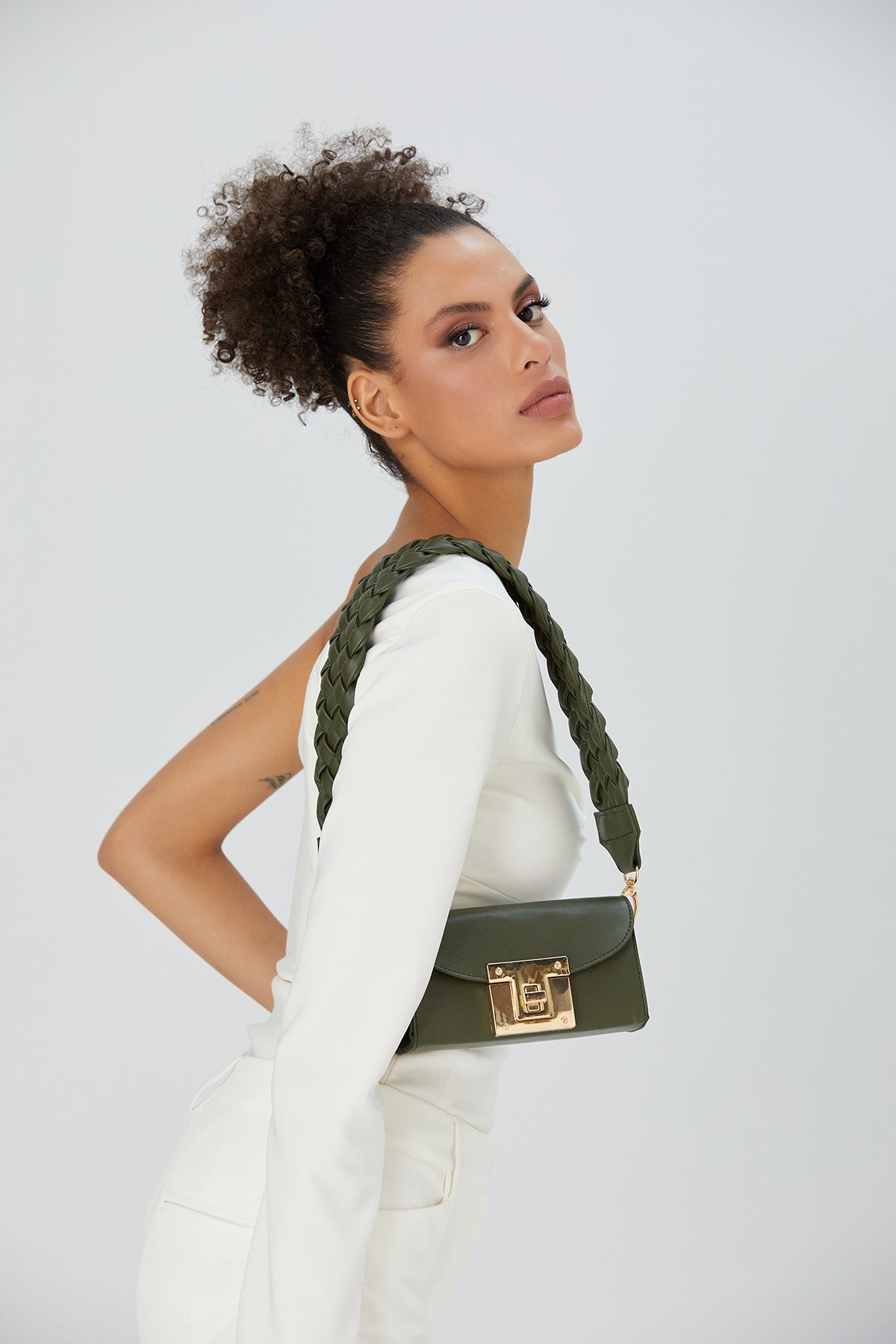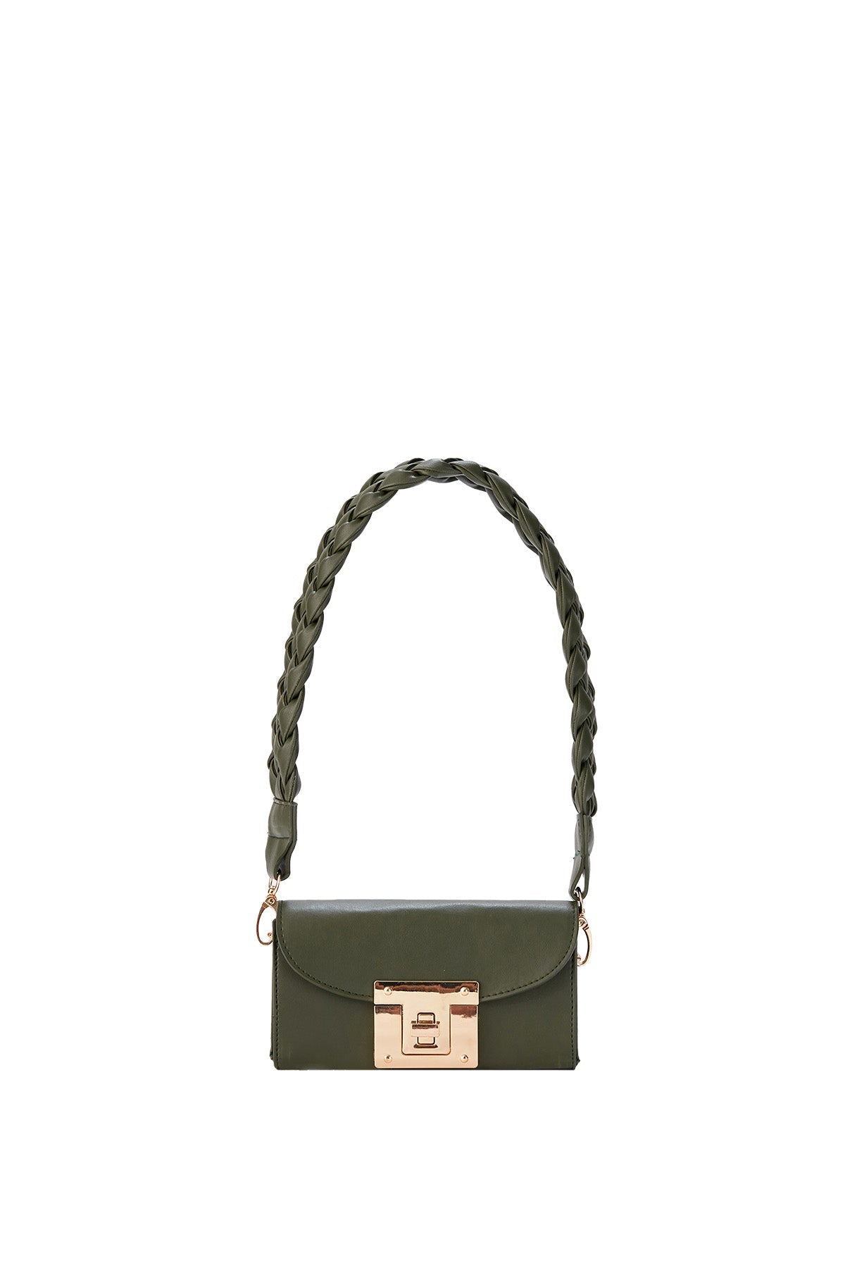 This mini shoulder bag features a thick braided detachable strap that makes a bold style statement. Perfect to hold a phone and lipstick for a night out. Crafted from premium vegan leather with a large gold twist lock closure.