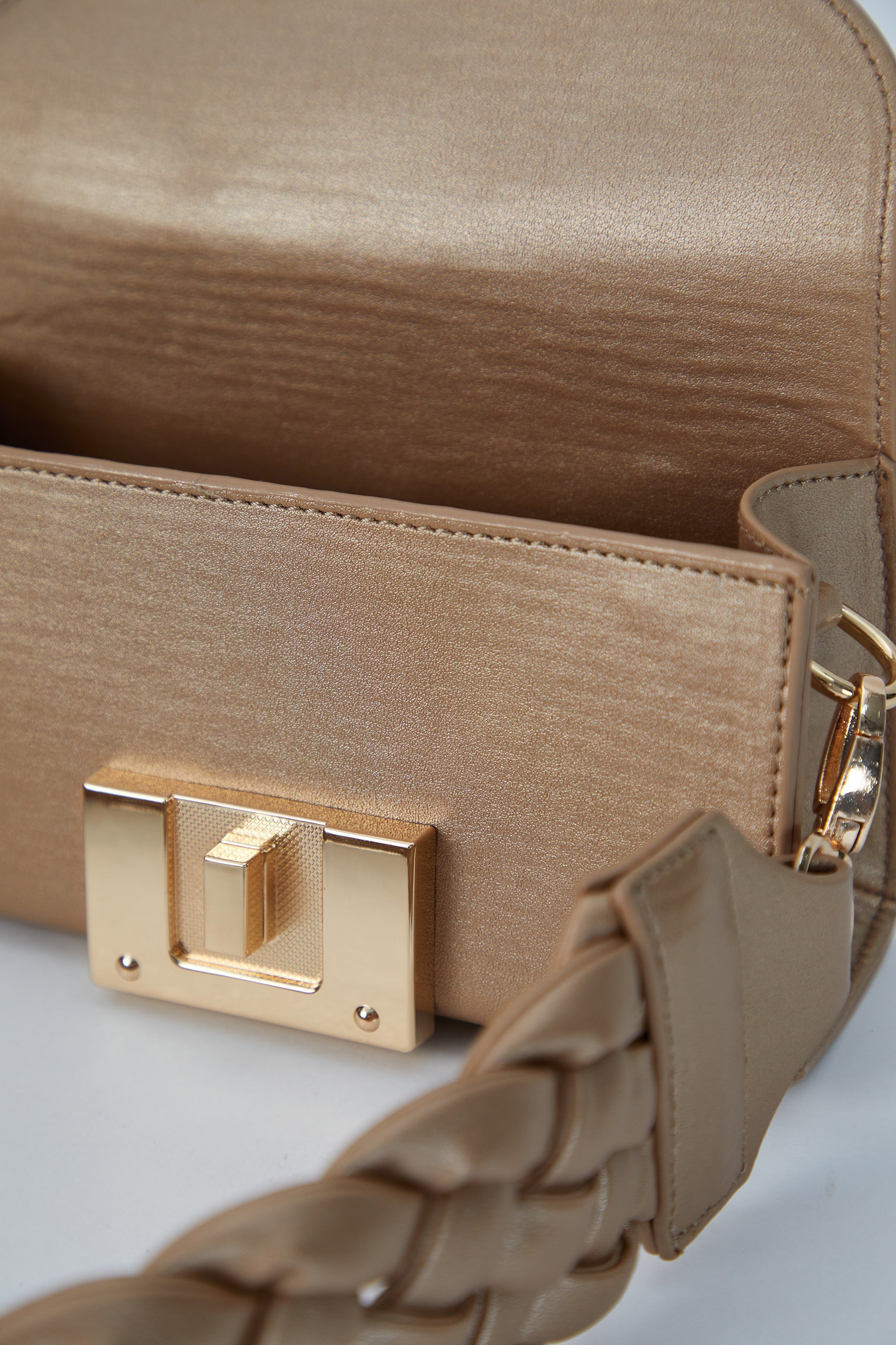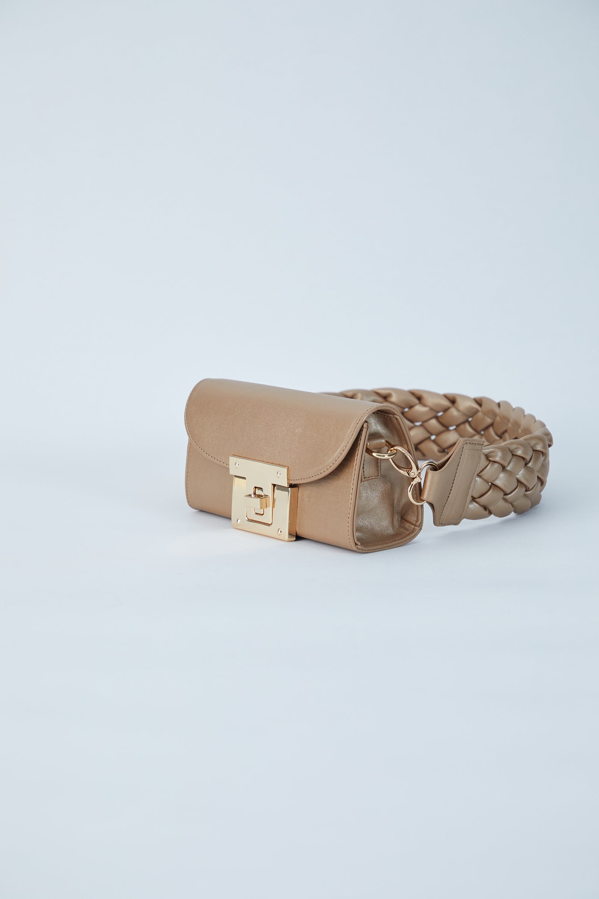 Bu mini omuz çantası, cesur bir stil ifadesi oluşturan kalın örgülü çıkarılabilir bir kayışa sahiptir. Bir gece dışarı çıkarken telefonunuzu ve rujunuzu tutmak için mükemmeldir. Büyük altın bükümlü kilitli kapatma ile birinci sınıf vegan deriden üretilmiştir.