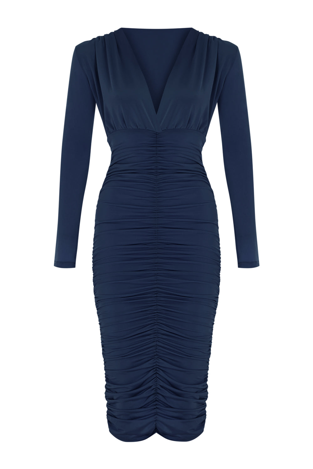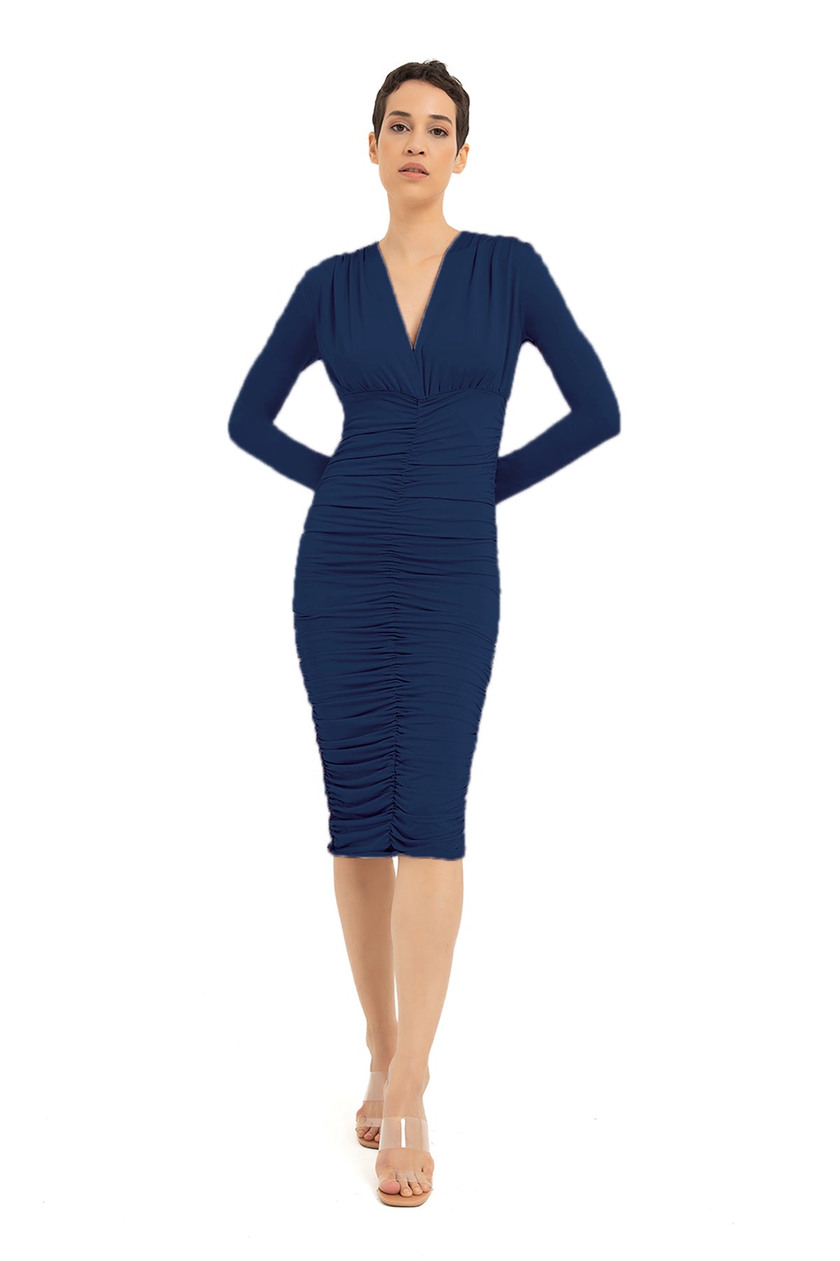 Elevate your fashion game with our elegant draped long-sleeved midi dress in sophisticated navy. This midi dress features a V-neck, and long sleeves, and is crafted from stretch fabric for both style and comfort. The draped fabric adds a touch of allure and sophistication. Whether you're attending a special event, a night out, or seeking an effortlessly chic look, this navy midi dress is your perfect choice.