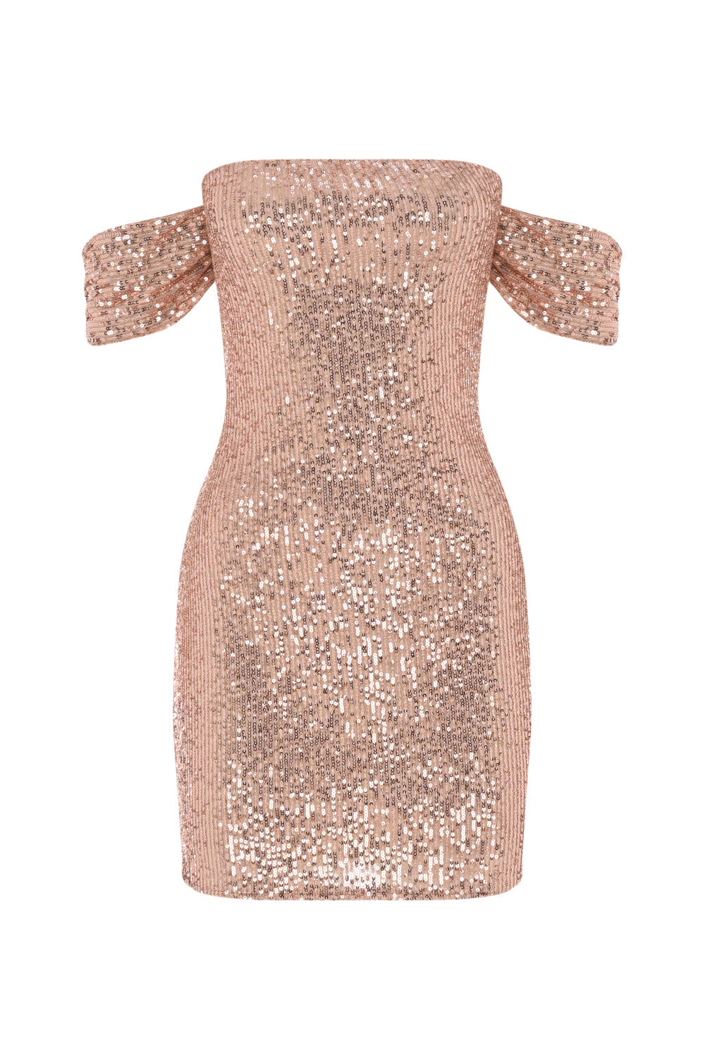 Step into the spotlight with our glamorous off-shoulder diamante sequin mini dress in elegant nude. This dress is the epitome of sophistication, featuring an alluring off-shoulder design adorned with diamante sequins that shimmer with every move. Whether it's a special occasion, a night out on the town, or a red carpet event, this dress is your perfect choice for making a dazzling impression.