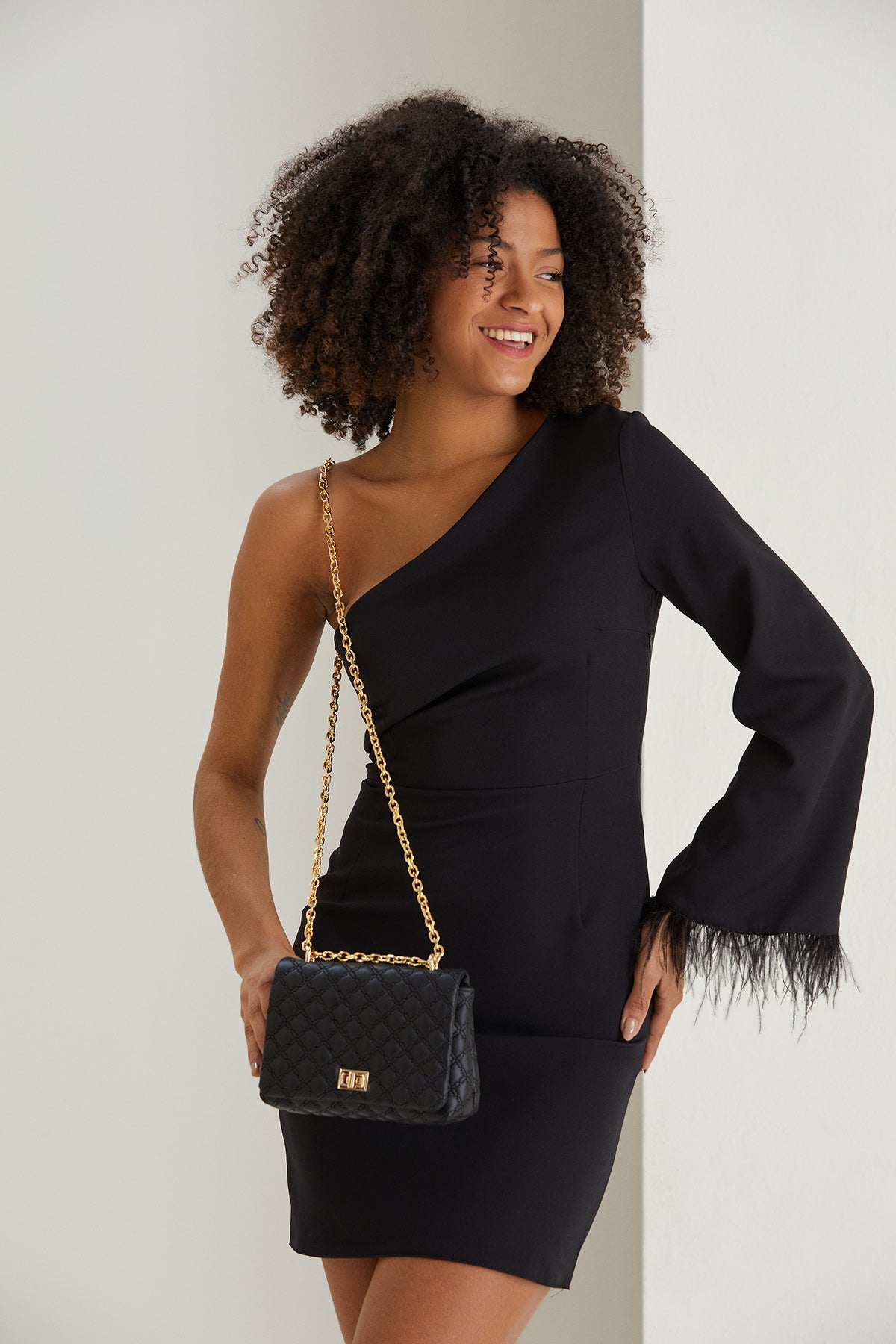Elevate your style with our chic one-shoulder mini dress in elegant black. This stunning mini dress features a trendy one-shoulder design adorned with faux feather cuffs, creating a glamorous and unique look. Whether you're headed to a cocktail party, a night out on the town, or a special event, this dress is your go-to choice for making a bold fashion statement.