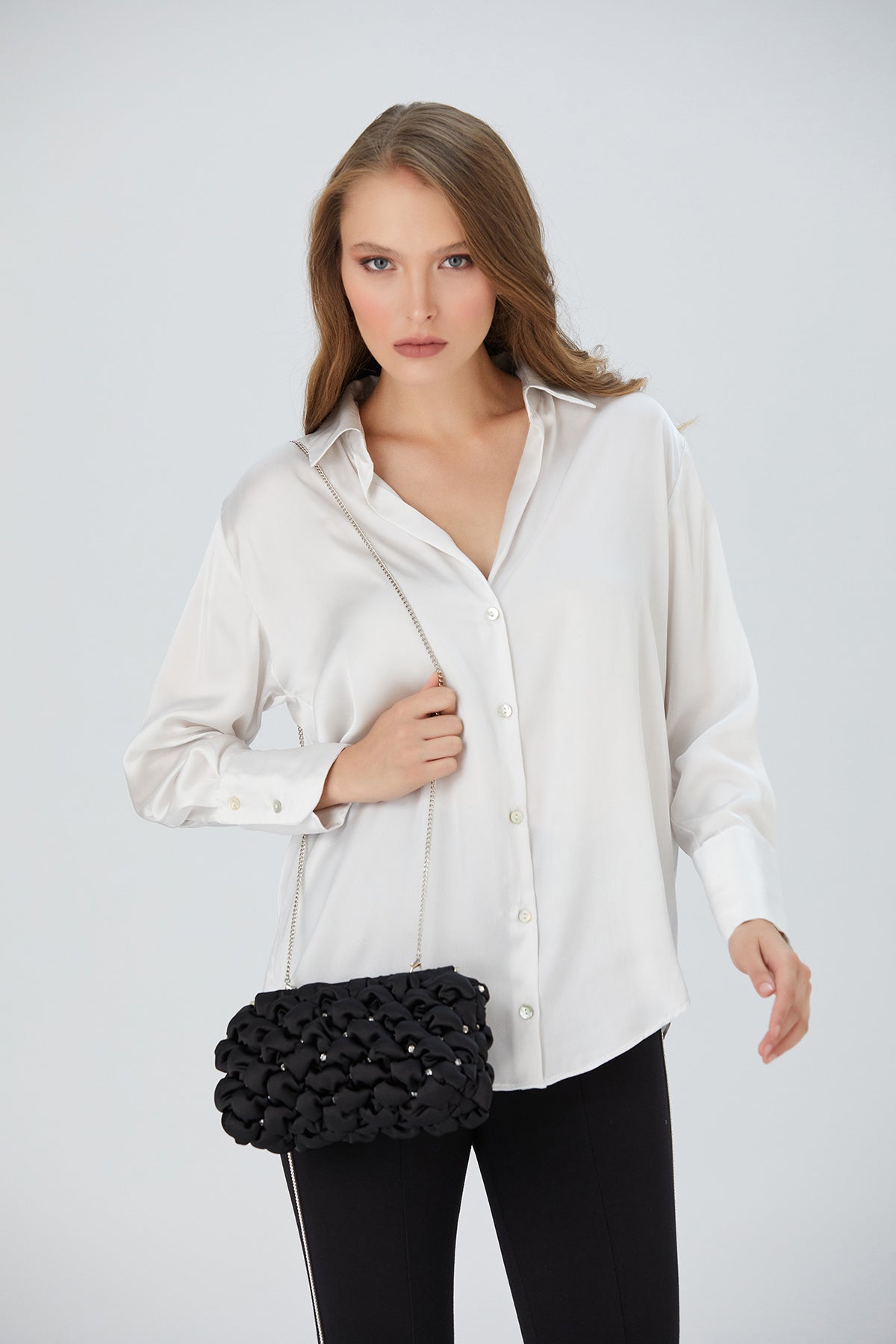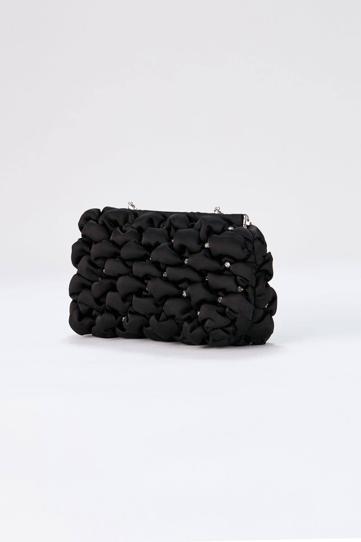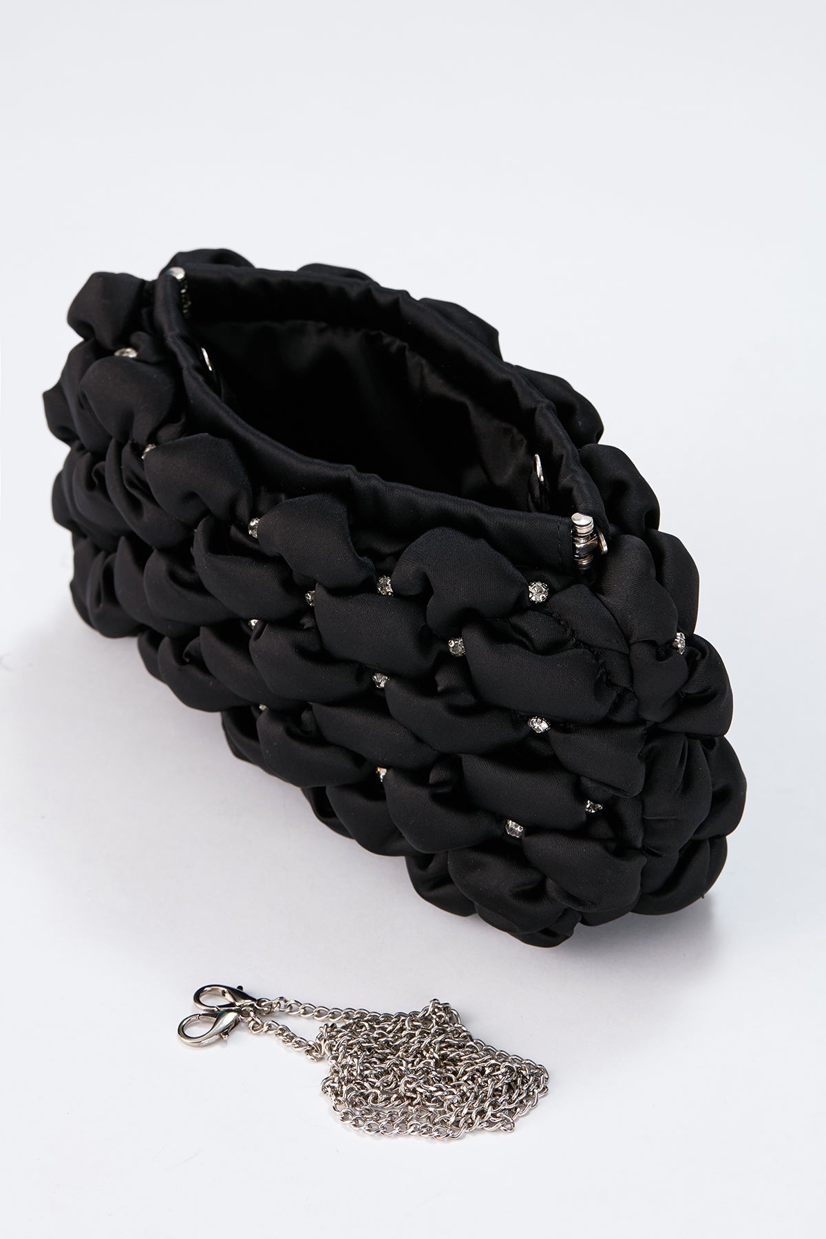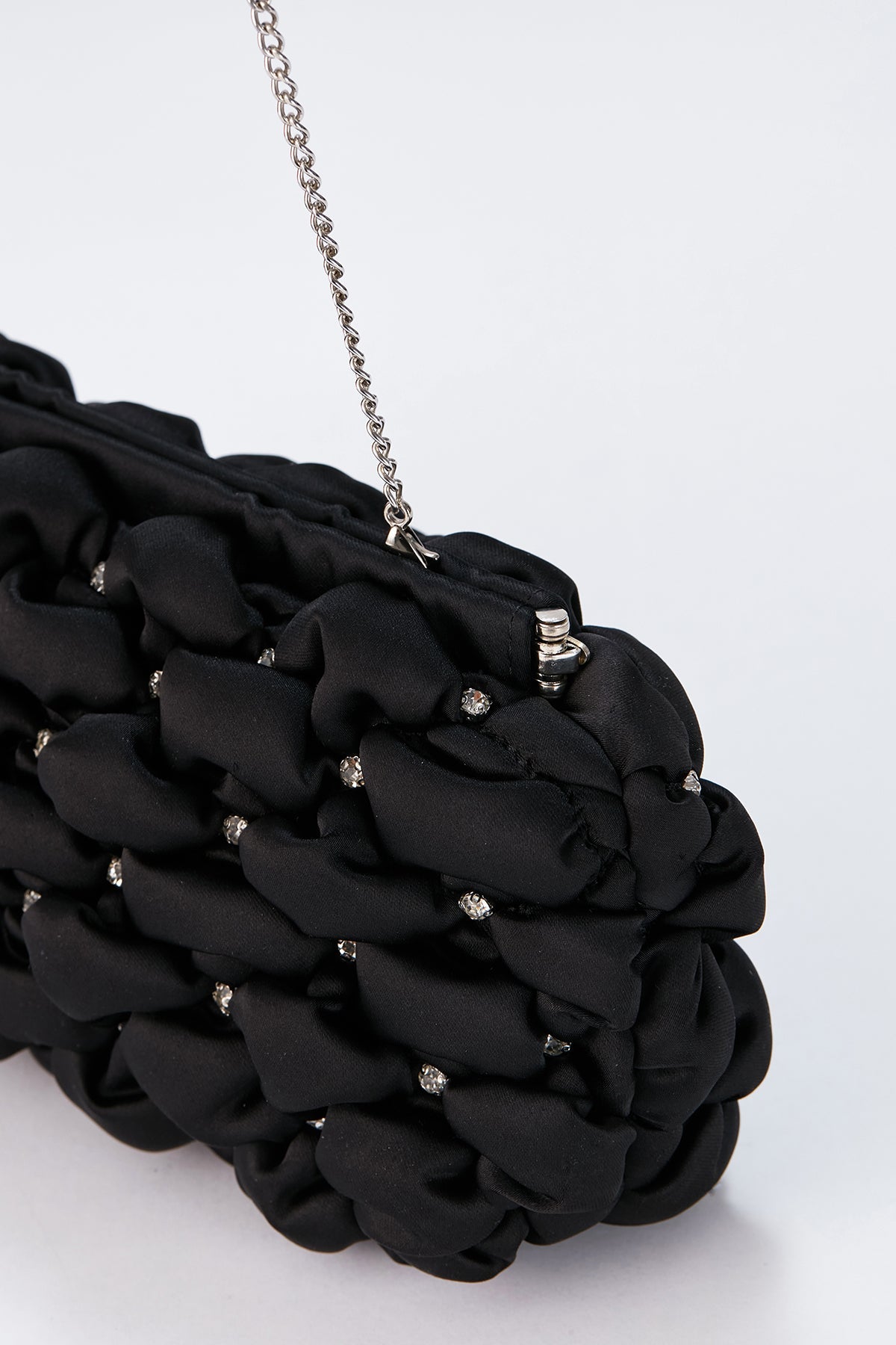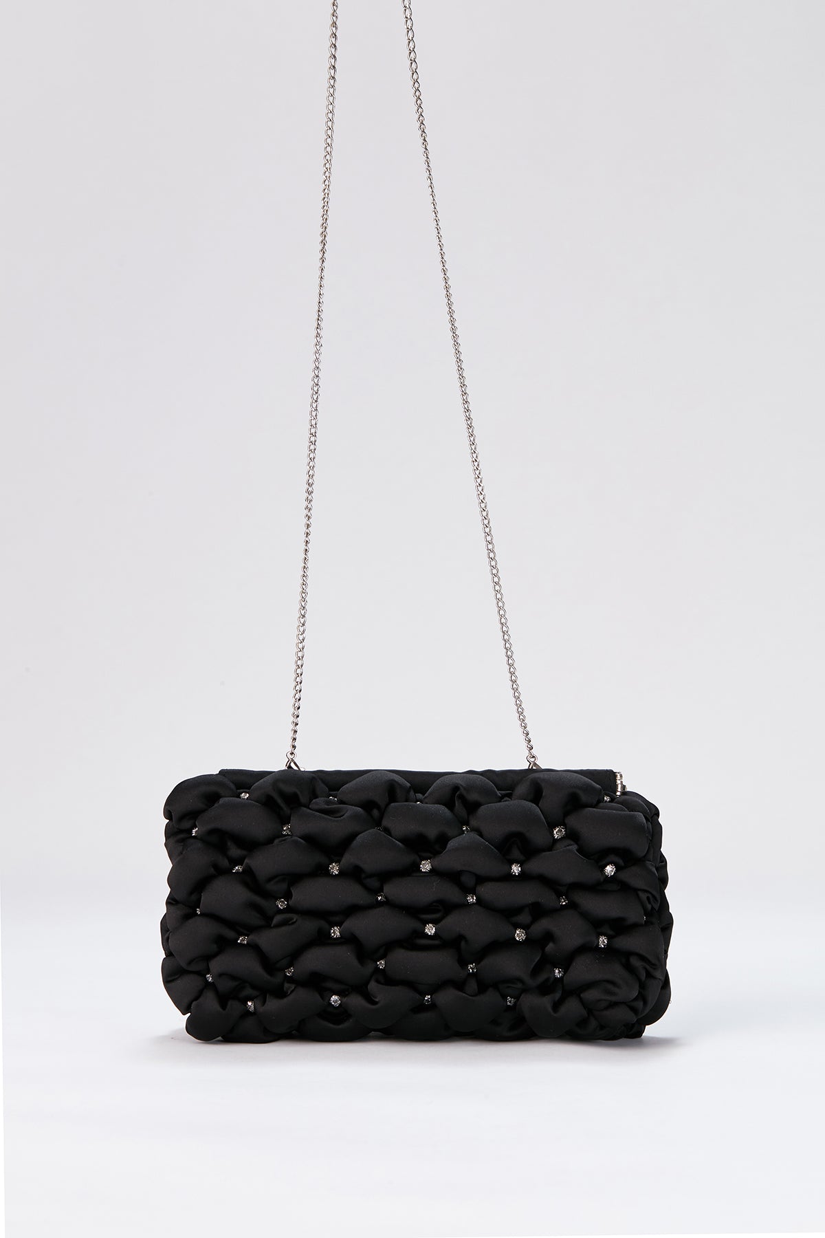 Elevate your elegance with our quilted, diamante studded clutch from Belissh. Embrace the allure of luxurious design and functional sophistication and make a lasting impression at any event. Crafted from premium recycled satin and featuring a cross body chain strap.