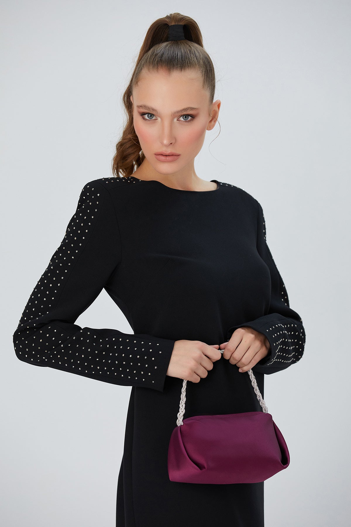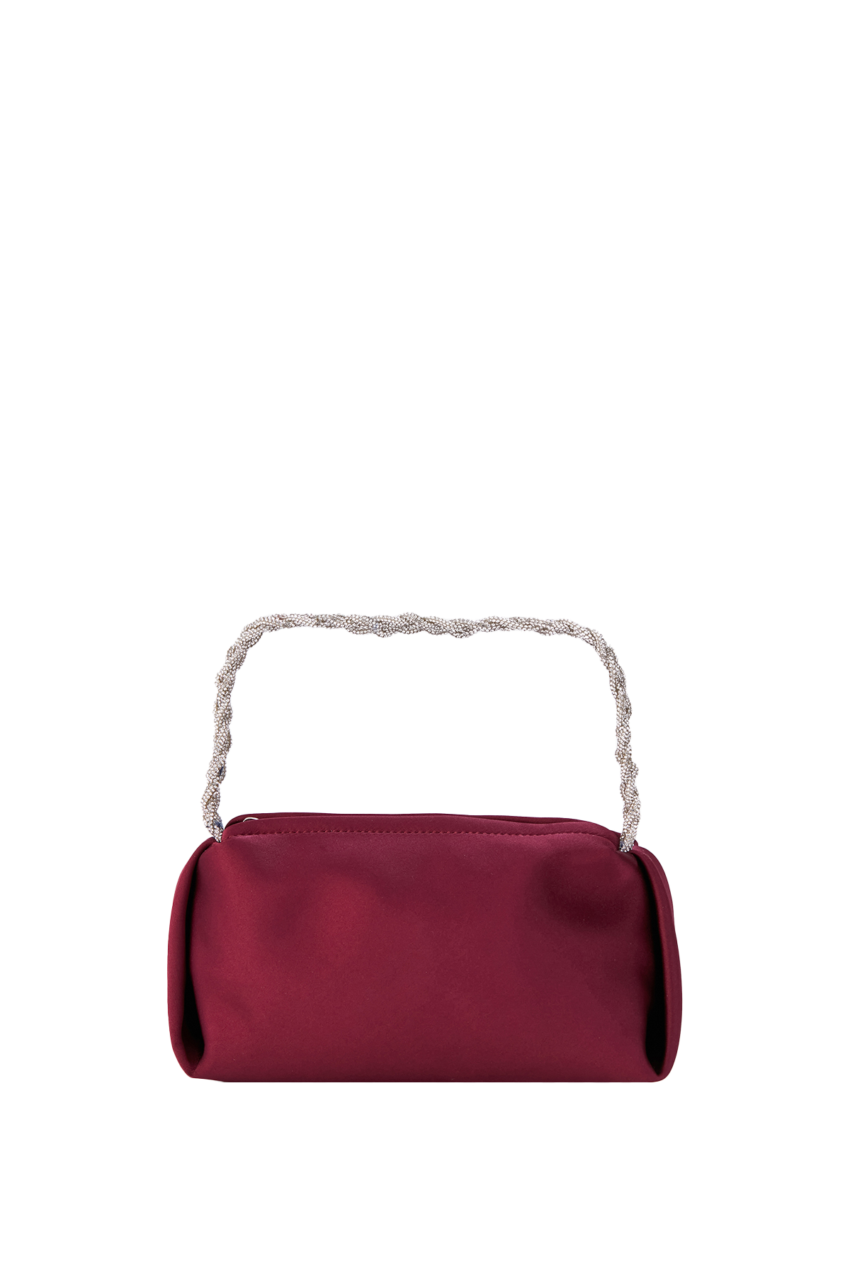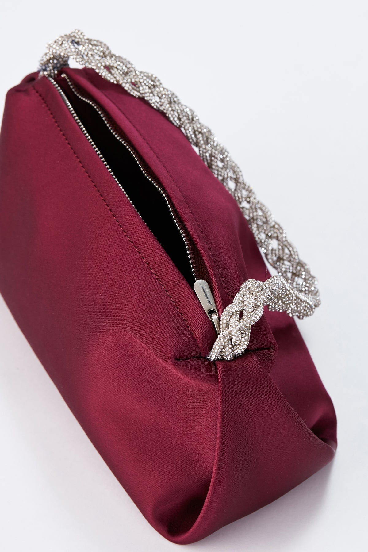 This stunning evening handbag is perfect for any special occasion. Handcrafted from premium recycled satin with a braided diamante handle. Fully lined, with one main compartment and a zip closure.