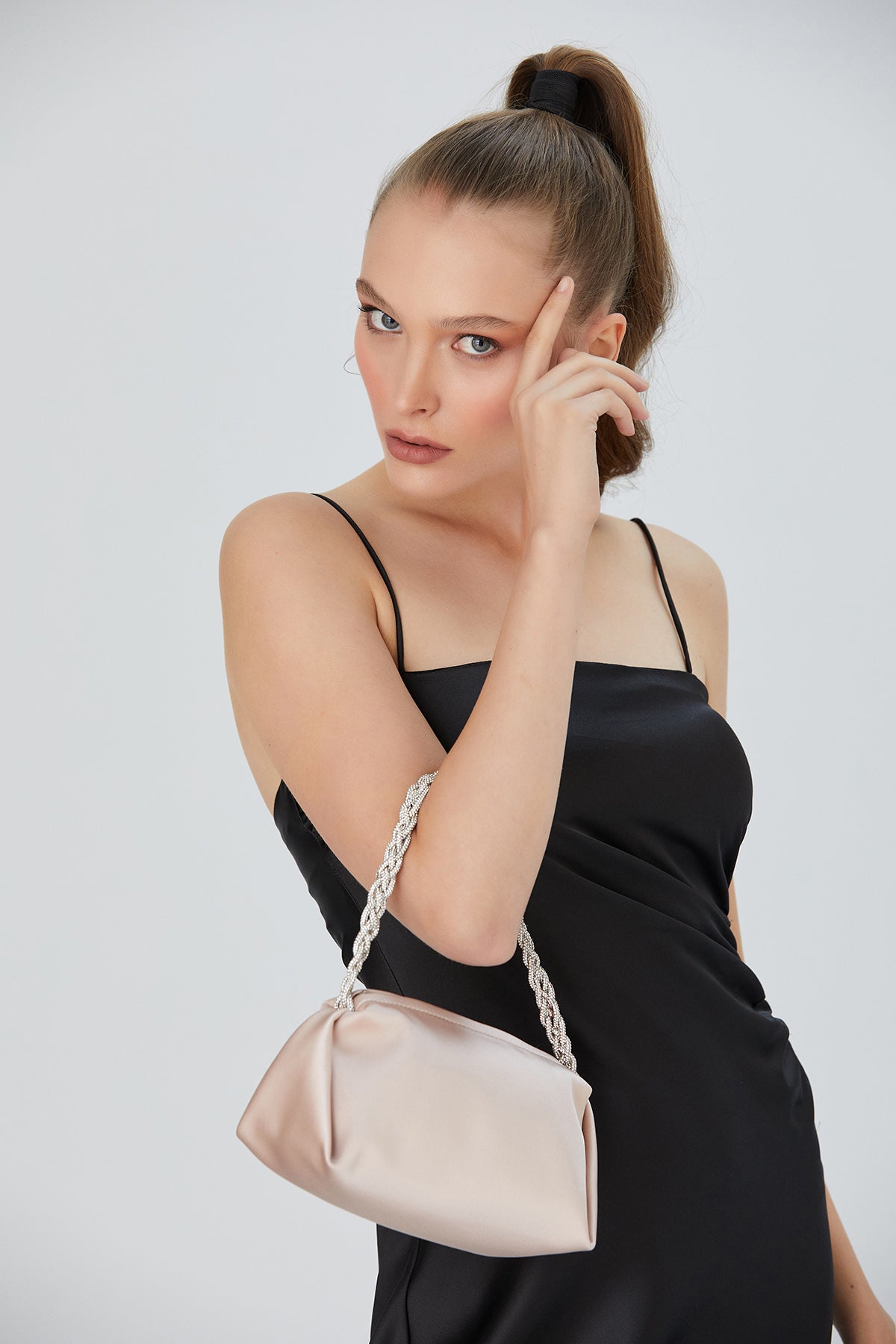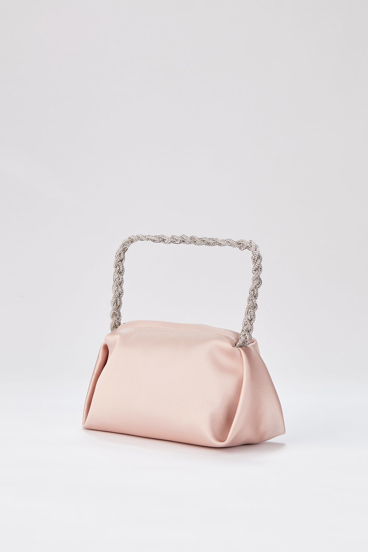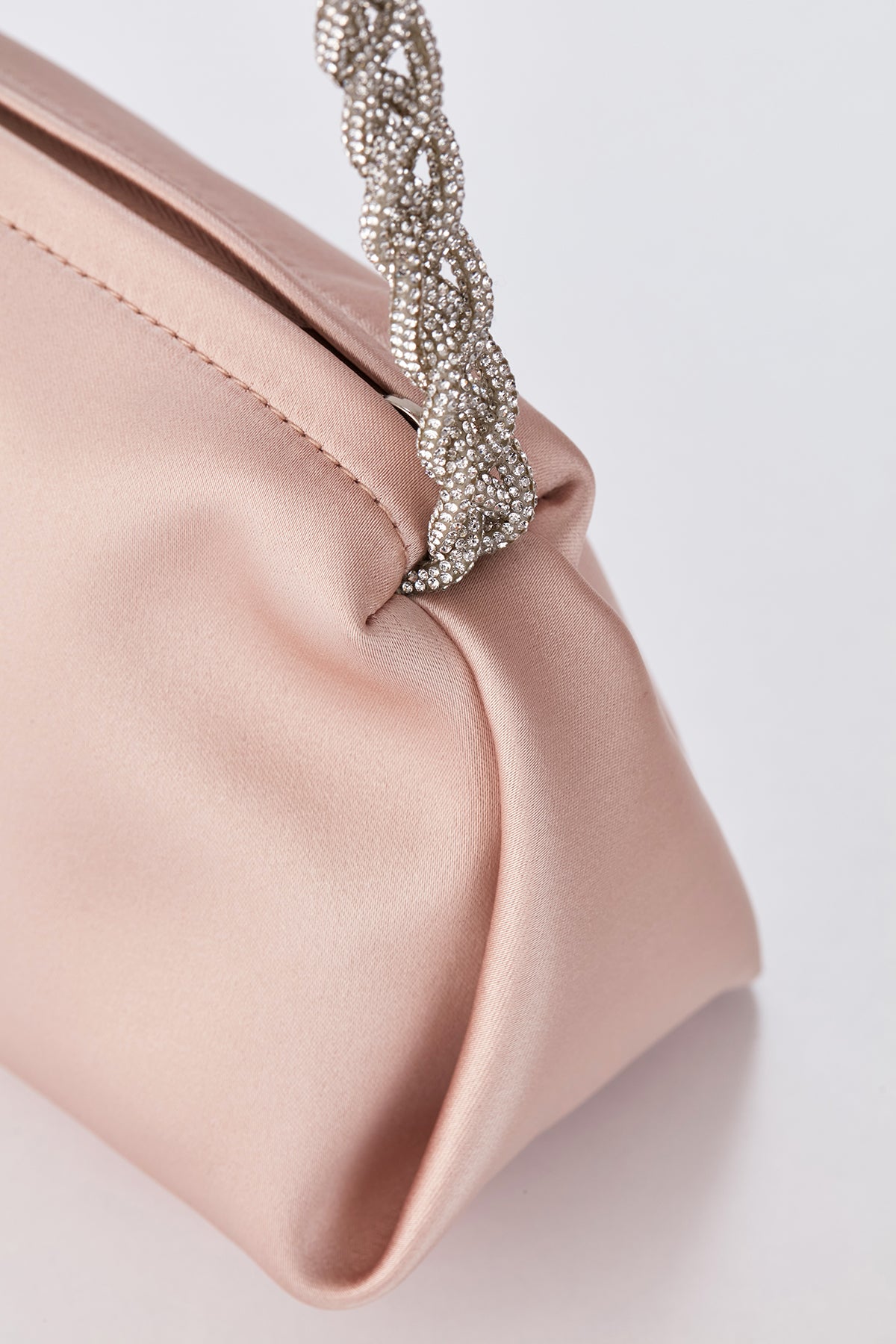 This stunning evening handbag is perfect for any special occasion. Handcrafted from premium recycled satin with a braided diamante handle. Fully lined, with one main compartment and a zip closure.