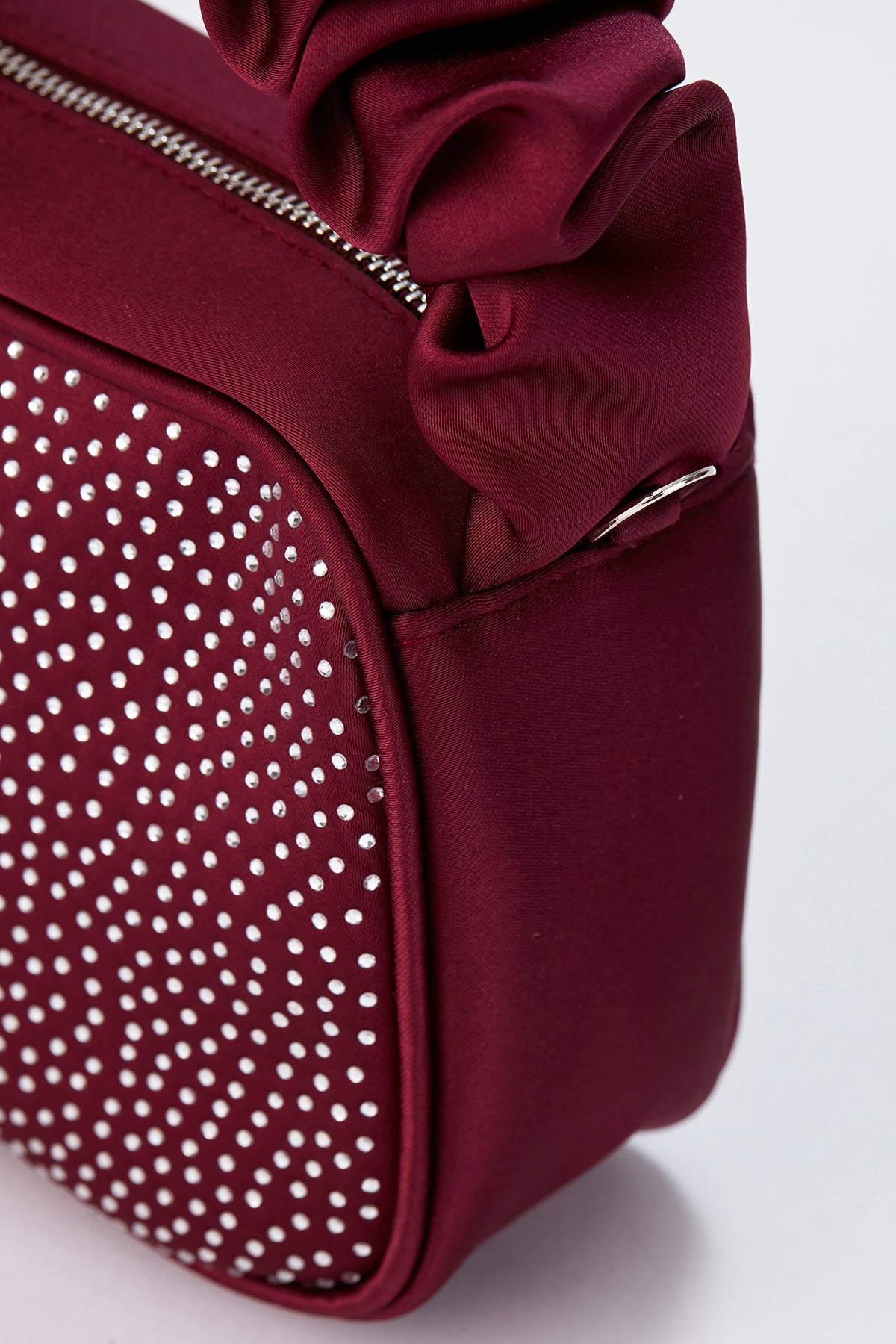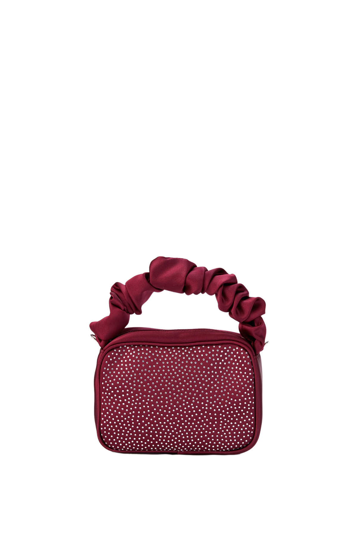 This cute little box-style handbag embellished with dazzling diamantes is perfect for making a statement at elegant dinners or evening events. Handcrafted from premium recycled satin. One main compartment, fully lined with a zip closure. Carry by the ruffled top handle, or wear across the body using the satin strap.