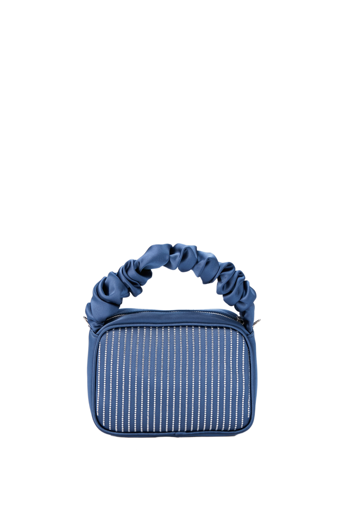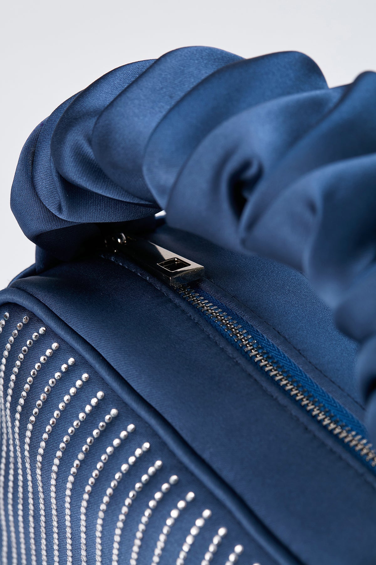 This cute little box-style handbag embellished with dazzling diamante stripes is perfect for making a statement at elegant dinners or evening events. Handcrafted from premium recycled satin. One main compartment, fully lined with a zip closure. Carry by the ruffled top handle, or wear it on the shoulder using the satin strap.