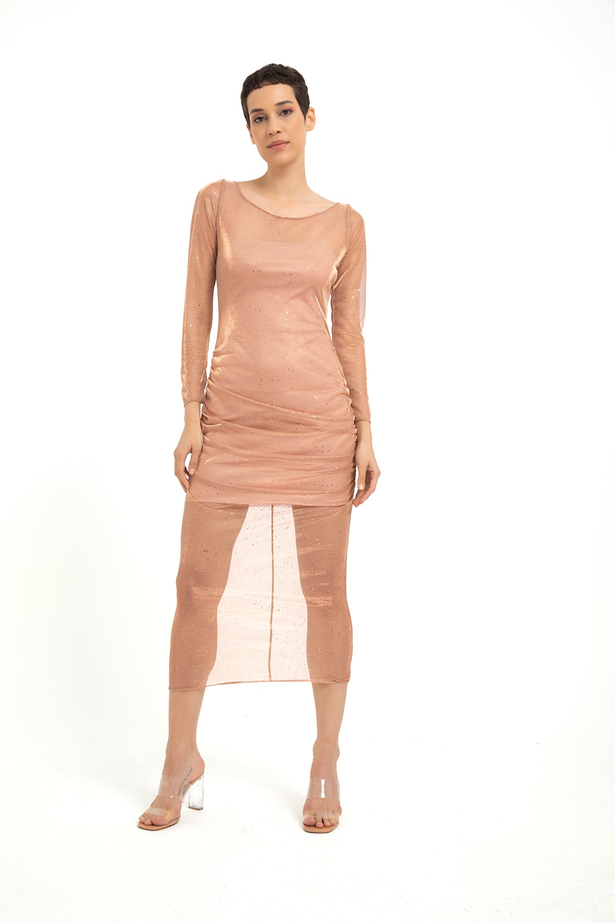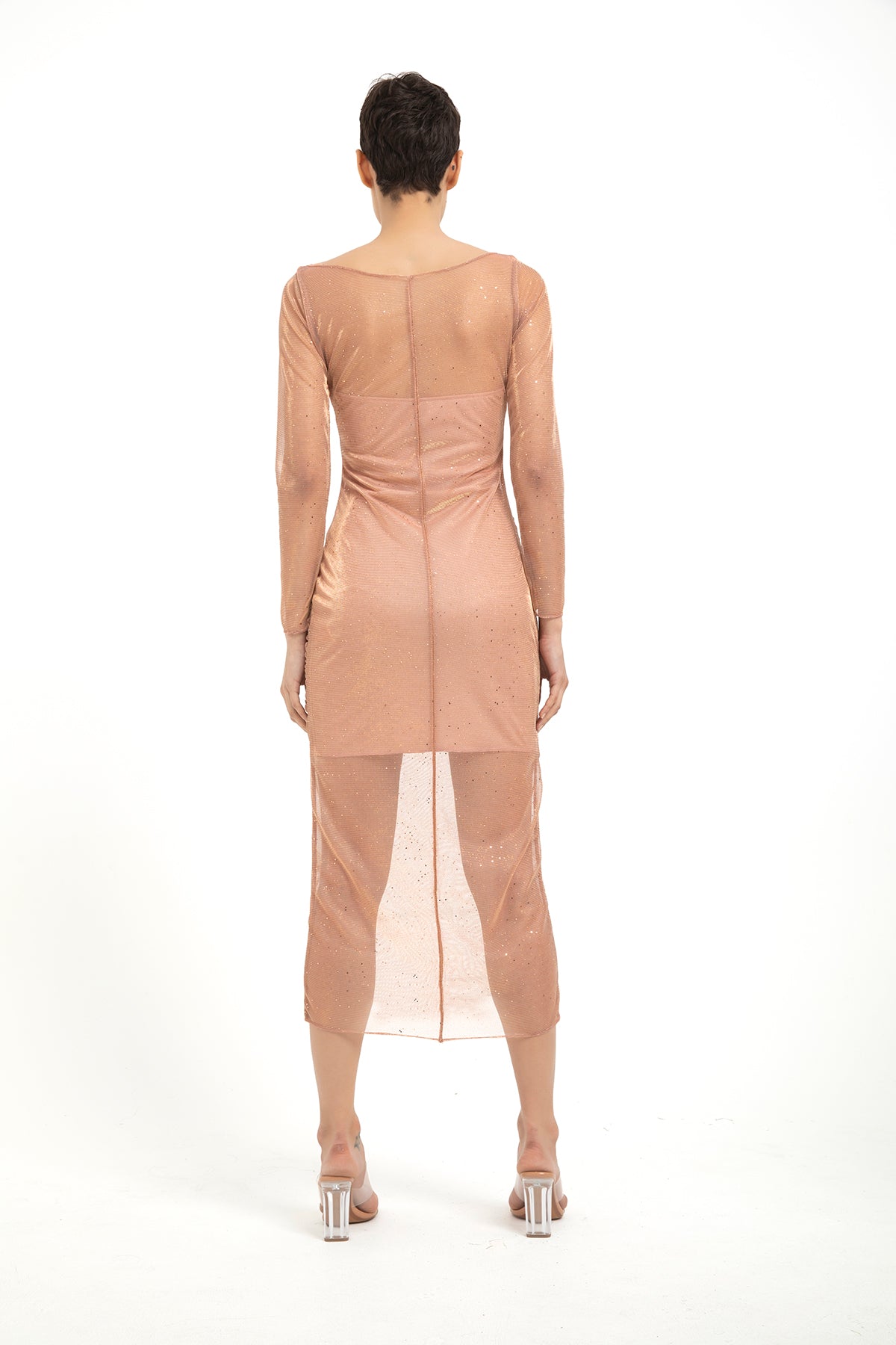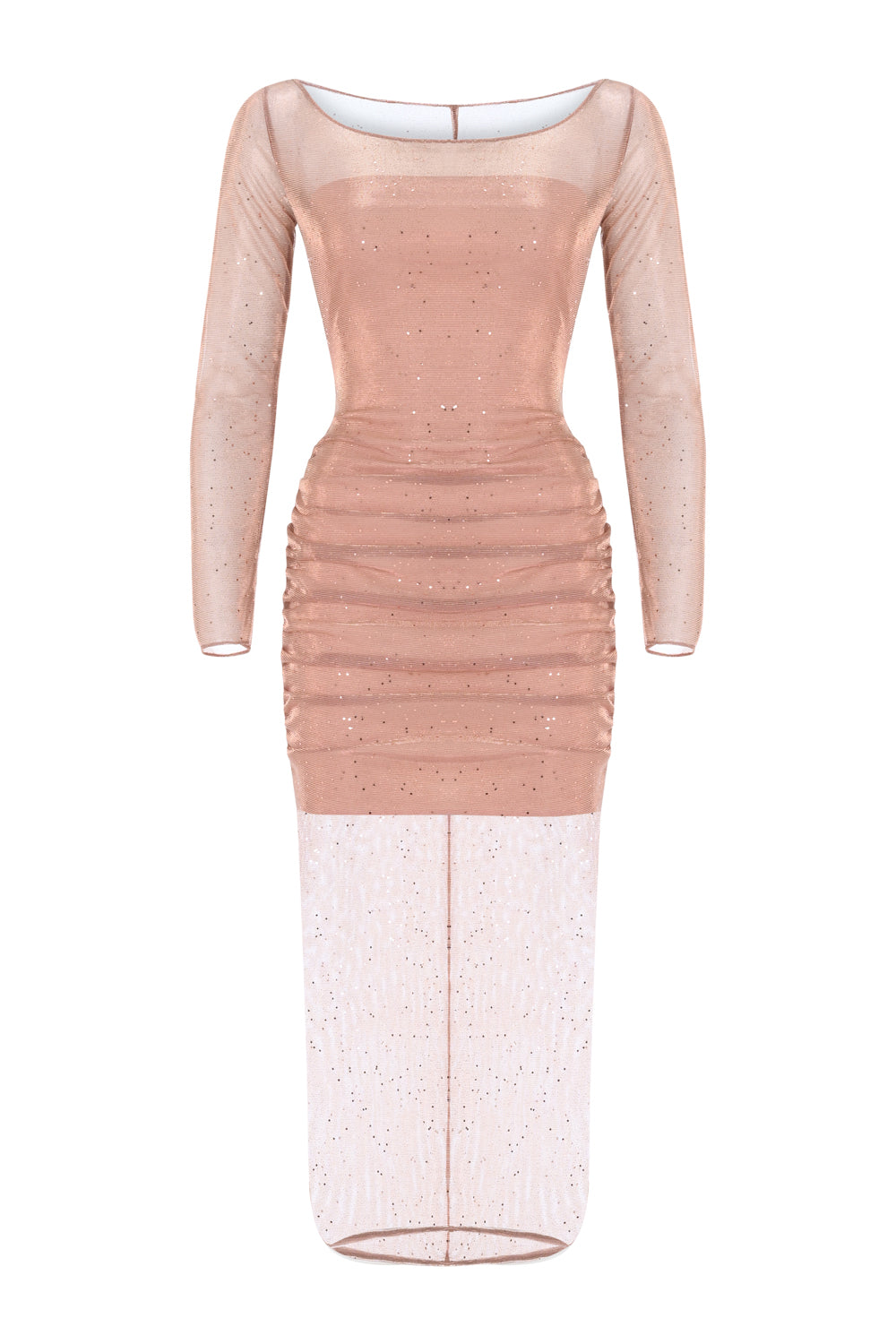 Elevate your elegance with our shimmery mesh midi dress in blush pink. This stunning midi dress boasts a captivating blend of style and sophistication, featuring a shimmery mesh fabric that catches the light beautifully. Whether you're attending a cocktail party, a wedding, or a special evening event, this dress is the perfect choice to make a lasting impression. With its figure-flattering silhouette and timeless design, you'll exude confidence and grace.