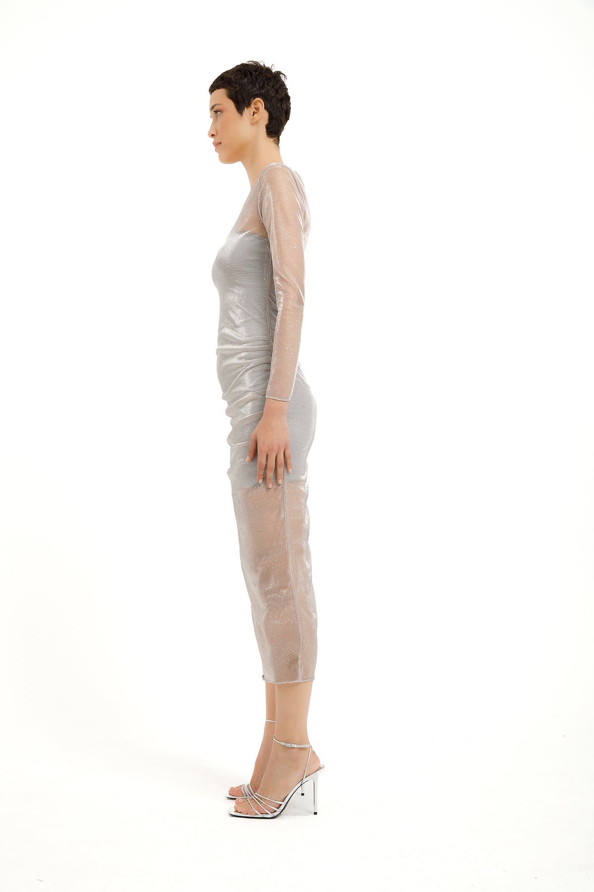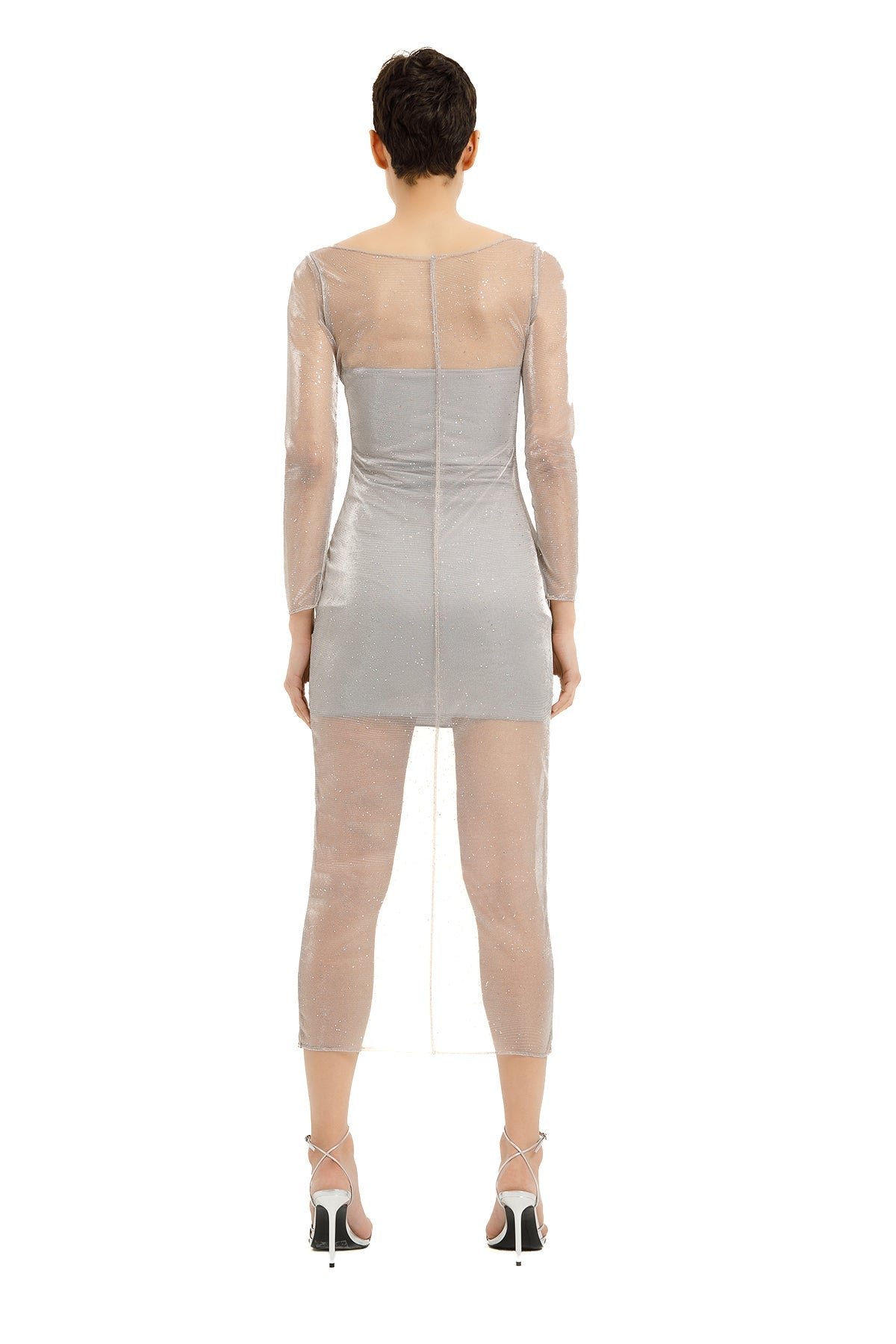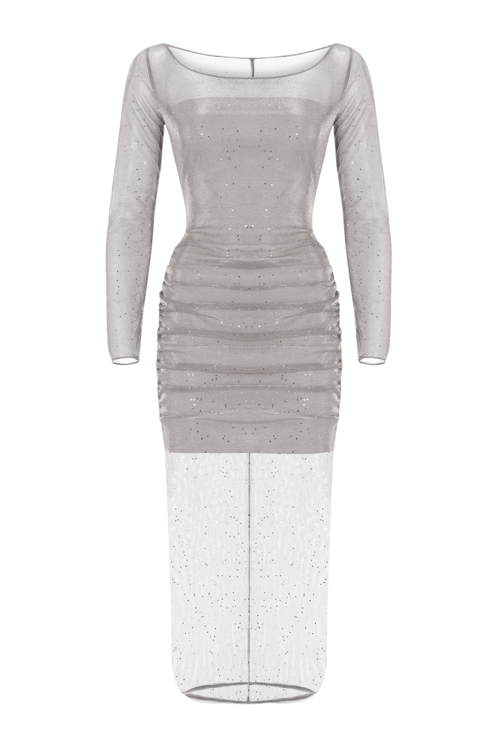 Elevate your elegance with our shimmery mesh midi dress in gray. This stunning midi dress boasts a captivating blend of style and sophistication, featuring a shimmery mesh fabric that catches the light beautifully. Whether you're attending a cocktail party, a wedding, or a special evening event, this dress is the perfect choice to make a lasting impression. With its figure-flattering silhouette and timeless design, you'll exude confidence and grace.