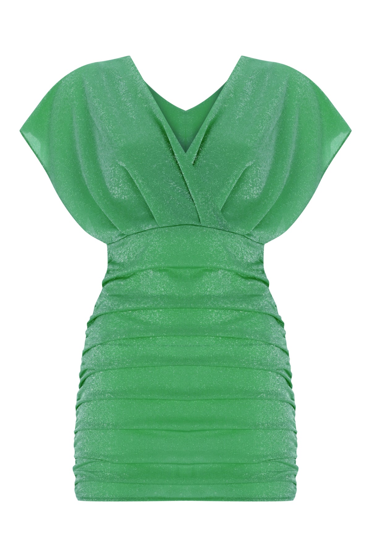 Elevate your elegance with our shimmery v-neck gathered, batwing mini dress in enchanting green. This dress exudes sophistication with its shimmery fabric, flattering v-neckline, and gathered details. Whether it's a special occasion, a night out, or a formal event, this dress is your go-to choice for making a memorable statement.