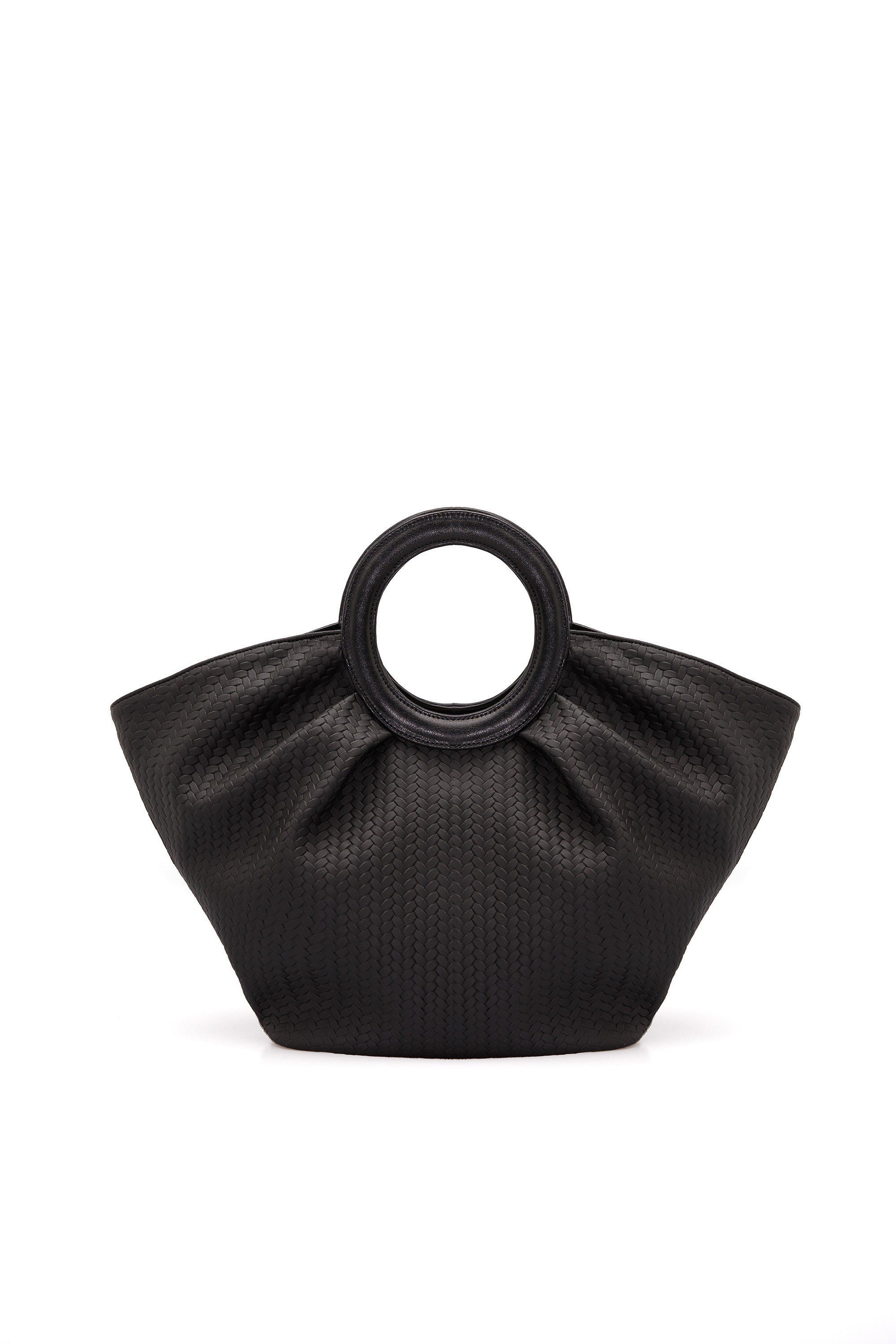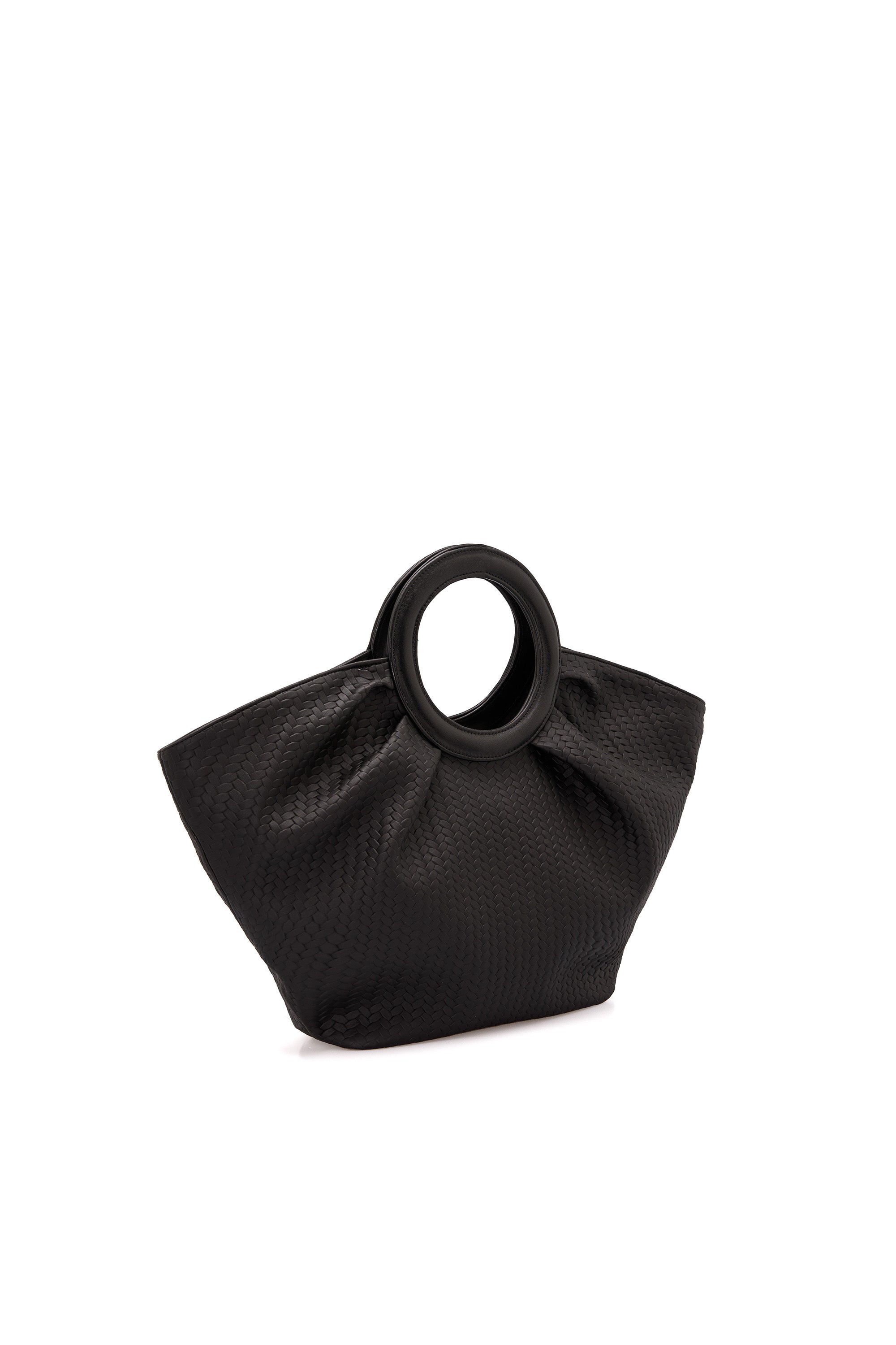 Elevate your fashion game with our fan tote bag. Its unique fan-inspired design meets practicality, offering ample space for your essentials while adding a touch of sophistication to your ensemble. Crafted from vegan leather in a finely braided weft. Features a small pocket inside and has a magnetic closure.